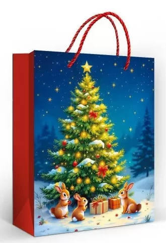 Обратите внимание на его красные боковые стороны и ручки, которые придают ему современный вид, а также на великолепную иллюстрацию с новогодней елкой и лесными зверями, которая дополнит общее оформление вашего праздника. Пакет предлагается в упаковке по 10 штук, что делает его еще более удобным для массовых мероприятий.