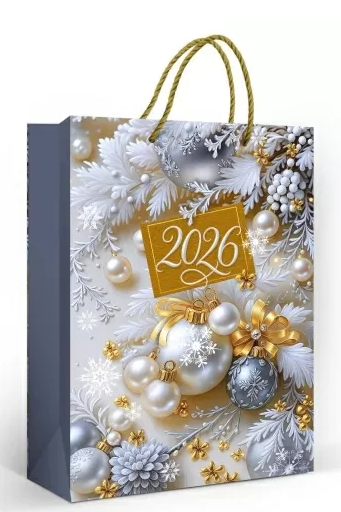Элегантный подарочный пакет формата ML станет стильным завершающим штрихом для вашего подарка. Его изысканный дизайн с серебряными и золотыми шарами, еловыми ветвями и декоративными лентами создаёт атмосферу праздника и внимания к деталям. Ламинированная матовая поверхность с эффектом тиснения и блеска делает упаковку не только красивой, но и приятной на ощупь.