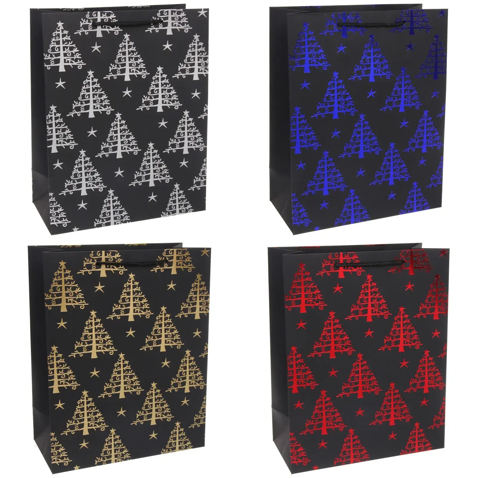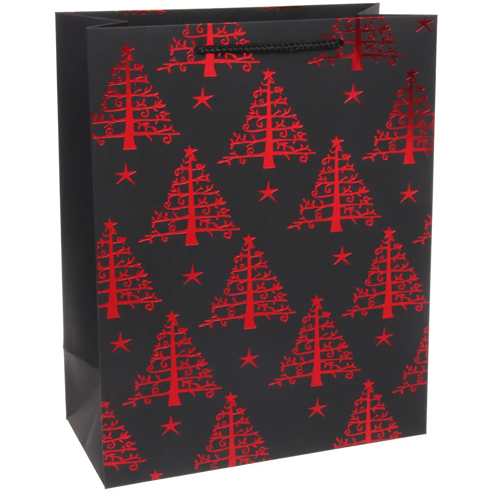 Подарочный пакет 'Лесные елочки' создаст праздничное настроение и подчеркнет важность вашего презента. Черный фон с изящными новогодними узорами выглядит элегантно и торжественно.