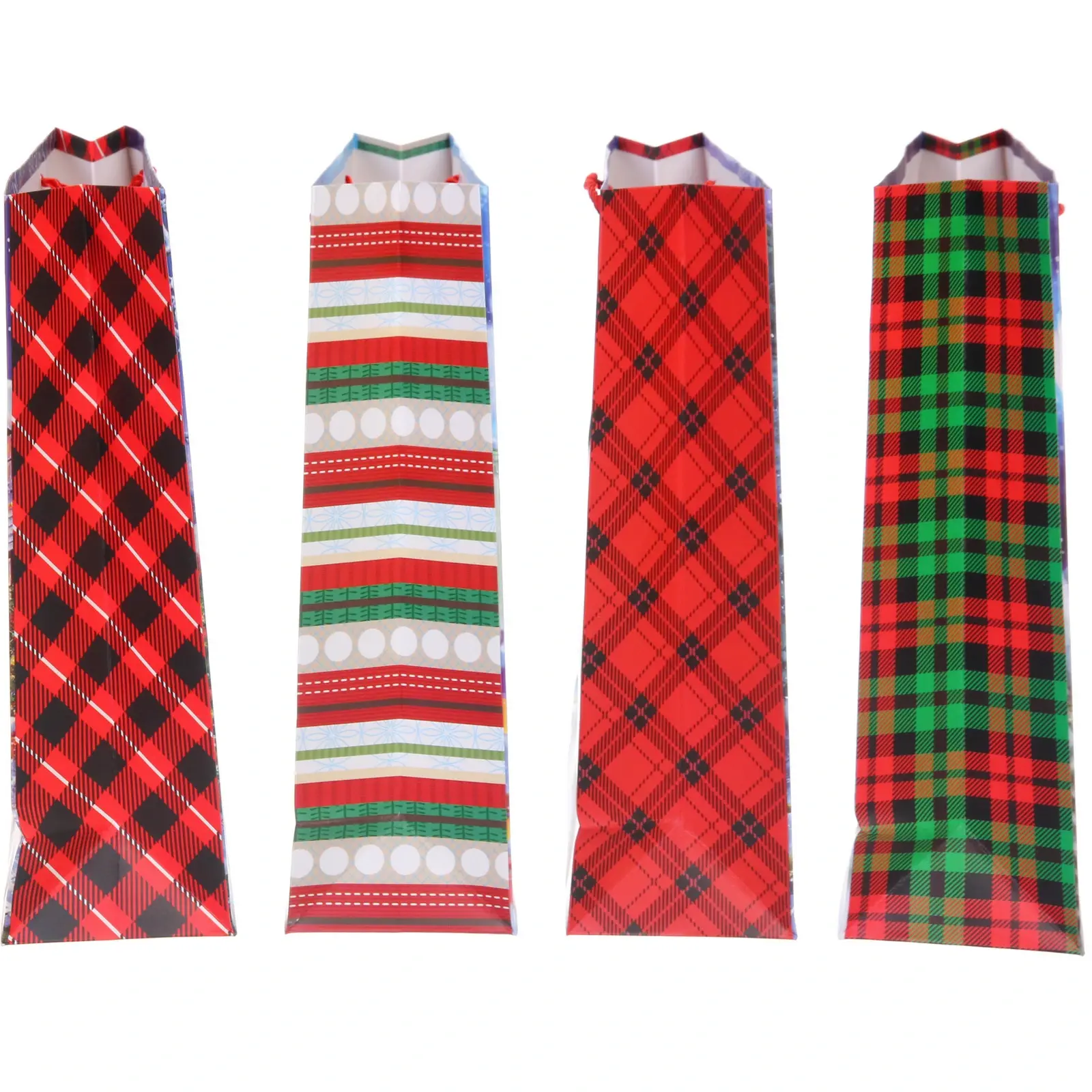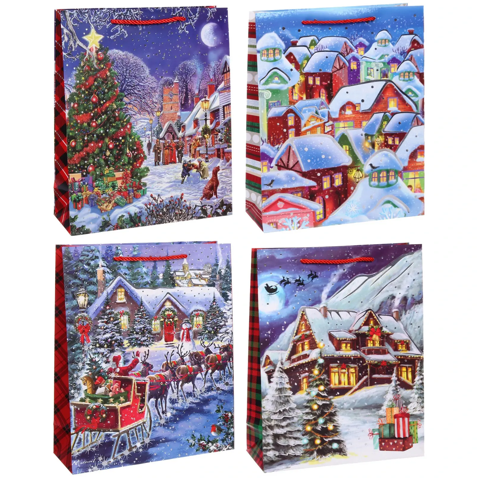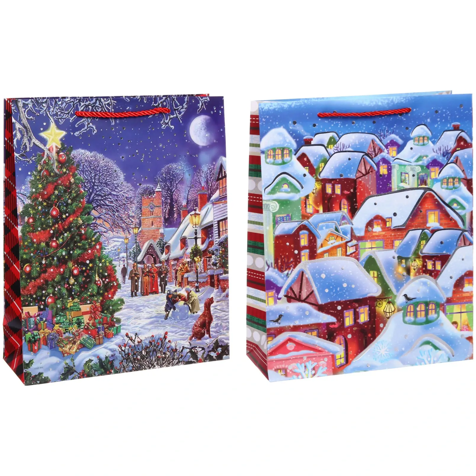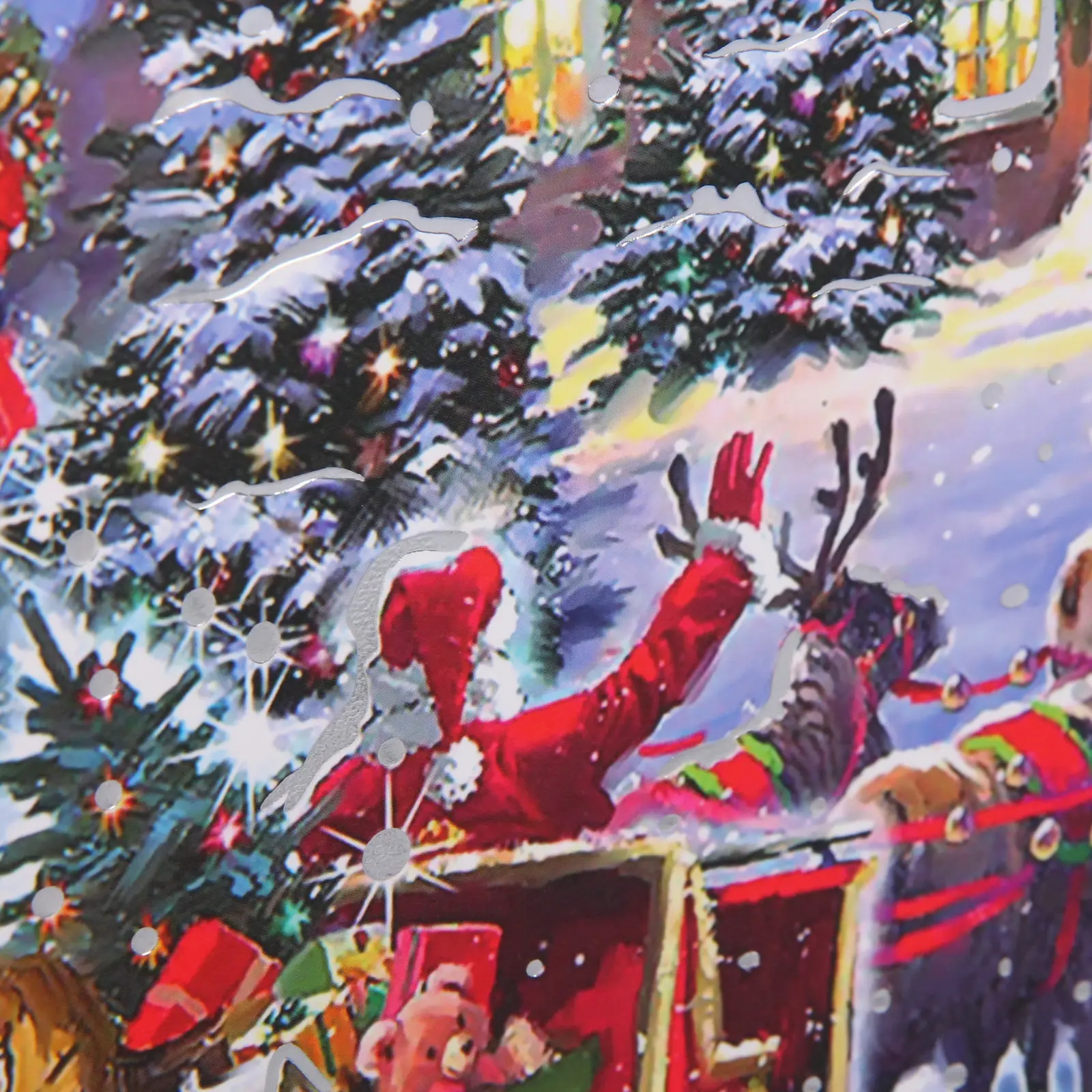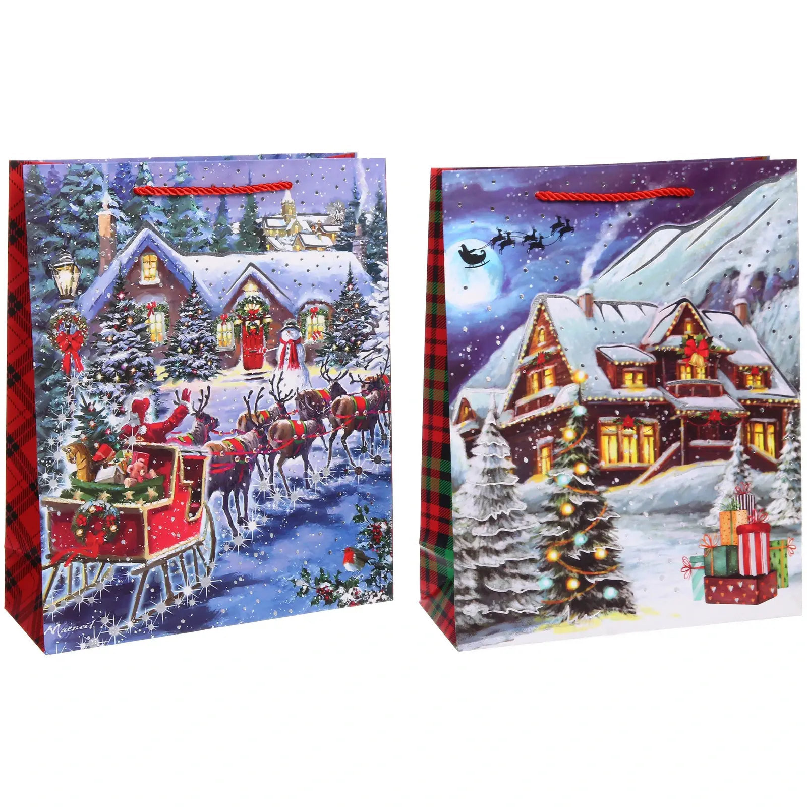 Подарочный пакет изготовлен из качественной бумаги с глянцевым покрытием. Размеры 26х32х10 см позволяют разместить как небольшие презенты, так и более габаритные подарки. Дизайн включает новогодние мотивы: Санта-Клаусы, эльфы, праздничные украшения в классической зимней цветовой гамме (красный, зеленый, белый, синий).