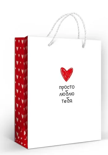 Белая лицевая сторона с красным сердцем и рукописной надписью гармонично сочетается с красными боковыми вставками с узором из сердечек. Такое оформление делает пакет универсальным — он подойдёт как для личных подарков, так и для оформления презентов в магазинах или при подготовке корпоративных поздравлений.