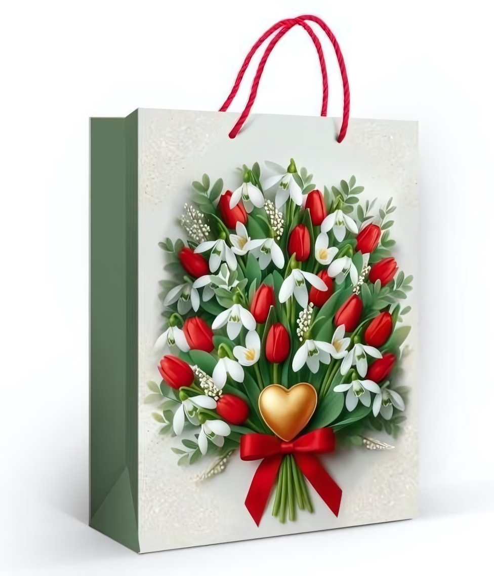 Пакет формата ML удобен для упаковки одежды, косметических наборов, книг, игрушек и других сюрпризов среднего размера. Универсальный дизайн с букетом цветов и декоративным сердцем гармонично смотрится на дне рождения, 8 марта, Дне всех влюблённых и других торжественных событиях.