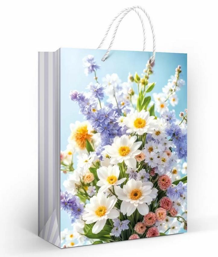 Подарочный пакет "Нежный букет" создаст безупречную презентацию вашего презента. Его нежный цветочный дизайн и элегантные шнуровые ручки придадут особый шарм любому подарку.
