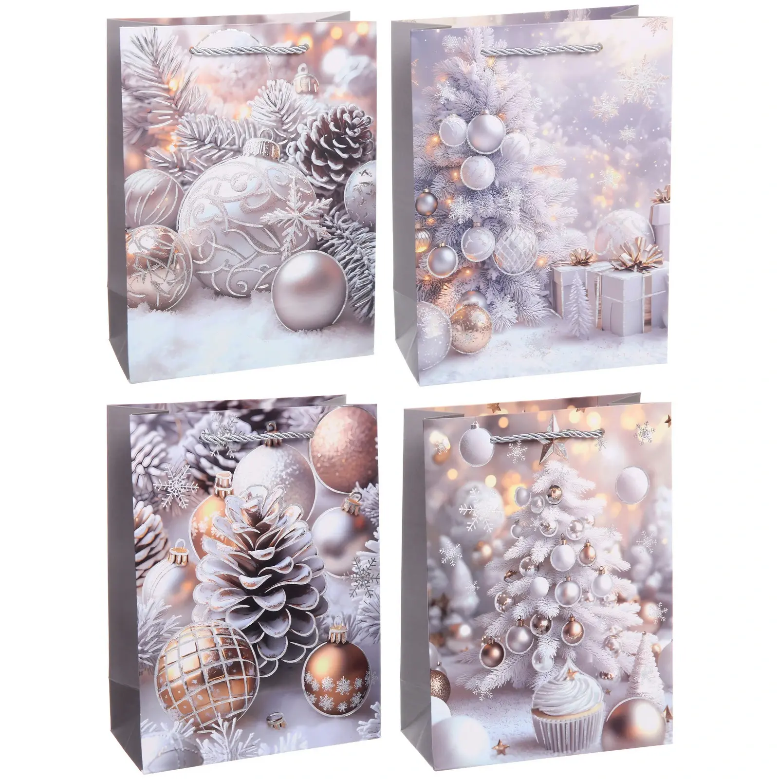 Размеры пакета (18*24*8.5 см) позволяют разместить подарки различных форм и размеров. Ассортимент зимних принтов включает изображения елок, снежинок и других новогодних элементов.