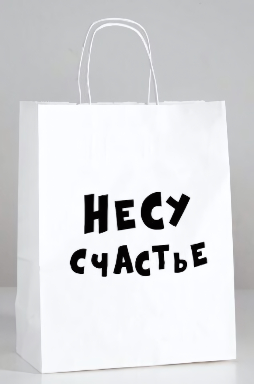 Создайте незабываемое впечатление с элегантным подарочным пакетом, который станет ярким акцентом любого сюрприза. Строгий белый фон и контрастная надпись «Несу счастье» превращают обычную упаковку в полноценную часть подарка.