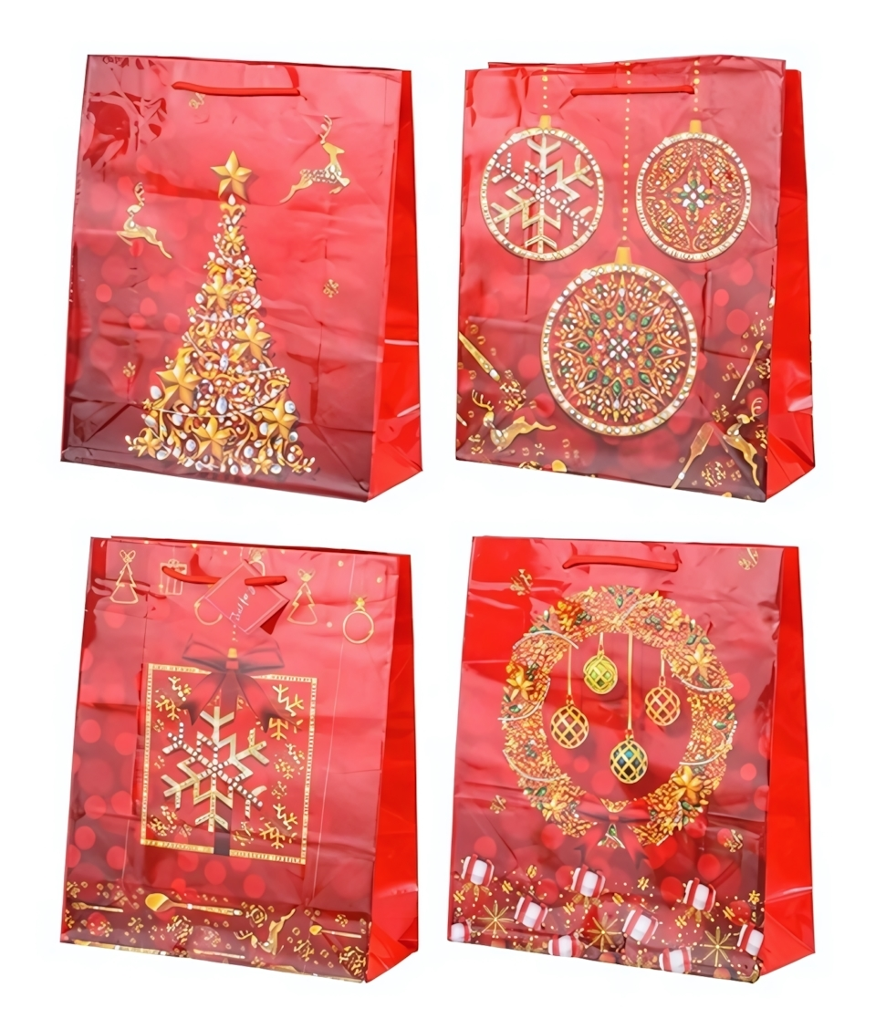 Пакет подарочный глянцевый "Новогодние", 26х32х12см, красный с рисунком (ассорти)