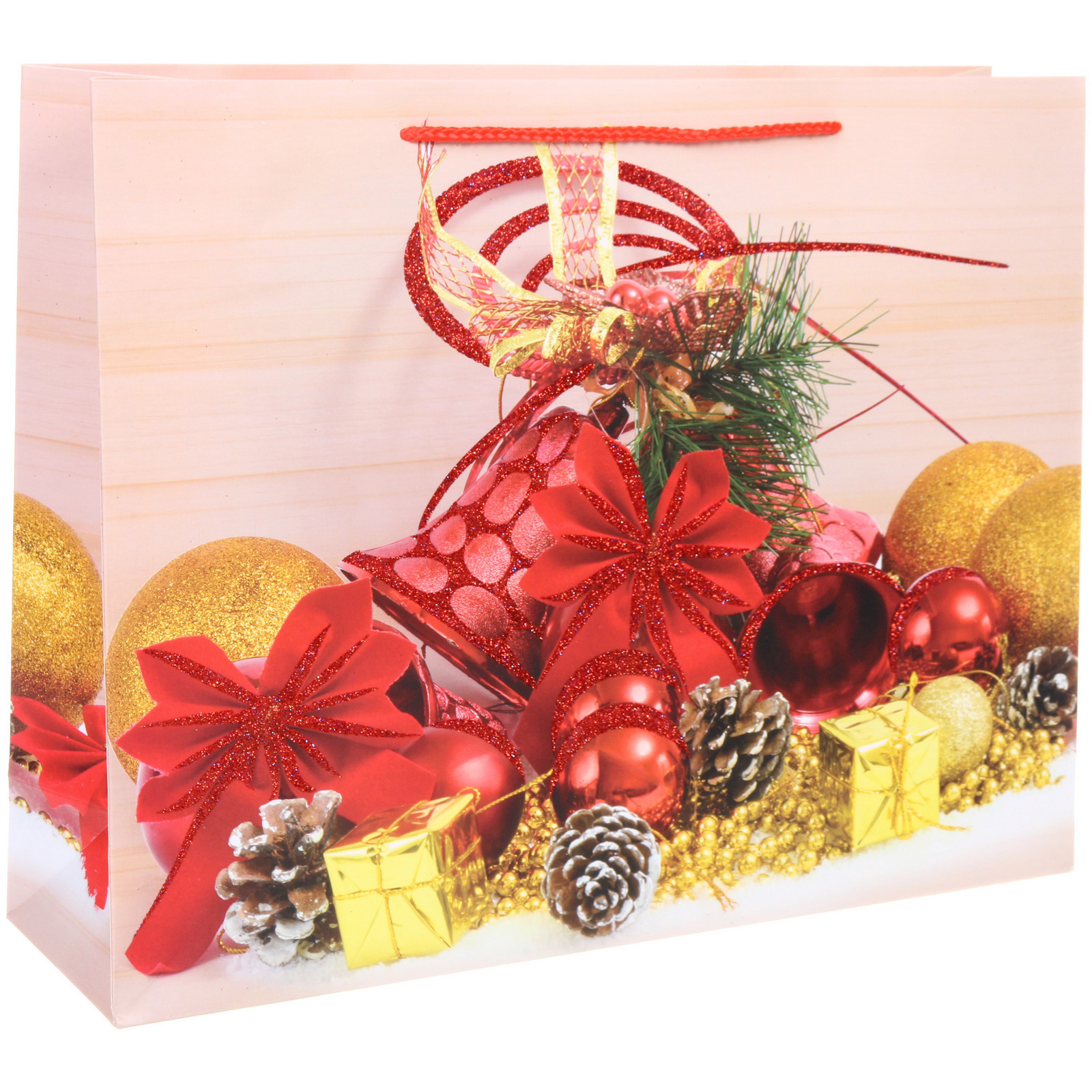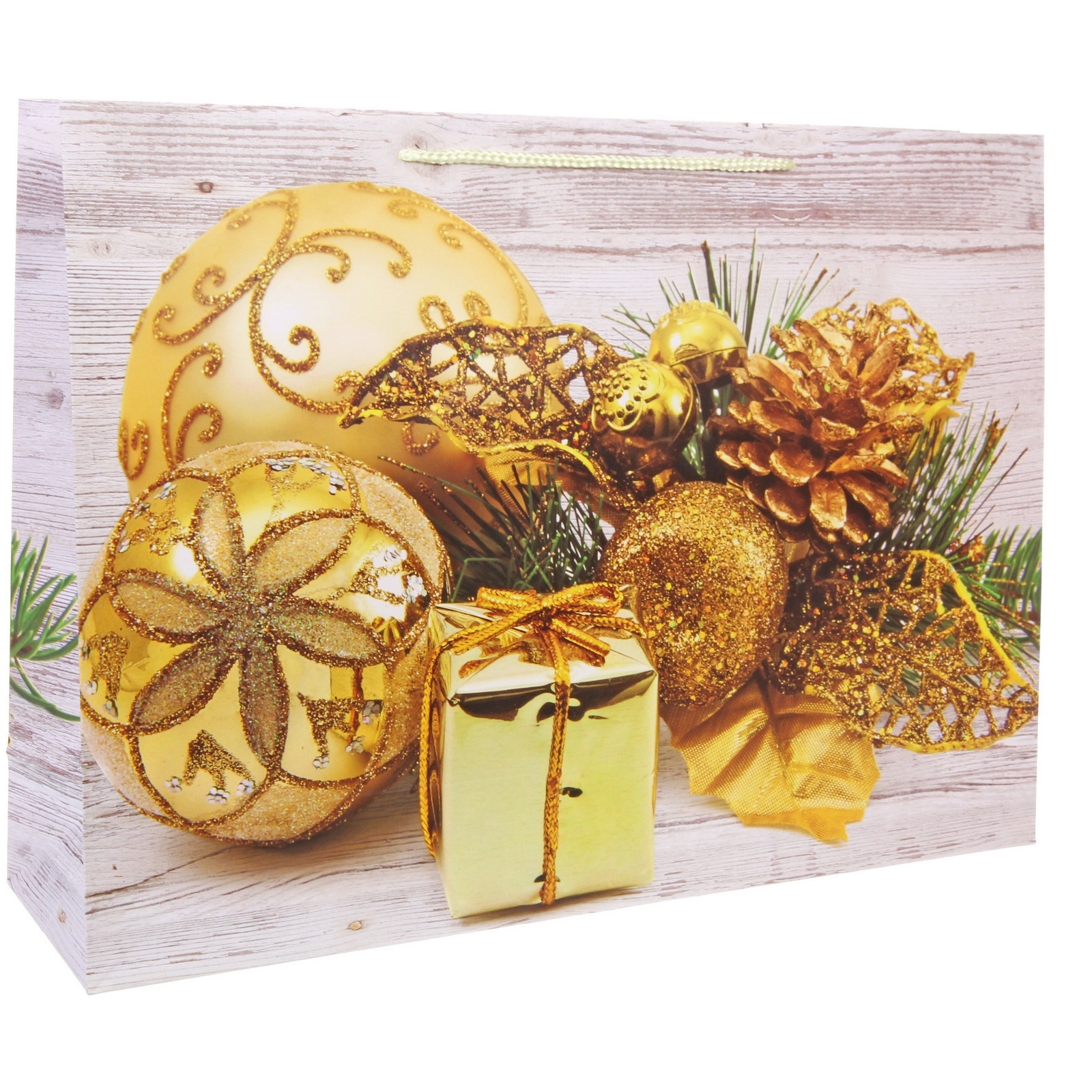 Пакет выполнен из плотной бумаги, что гарантирует его надежность. Дизайн включает в себя золотые и красные элементы, что делает его универсальным для различных подарков. Он станет отличным дополнением к вашему новогоднему декору и поможет создать атмосферу праздника.