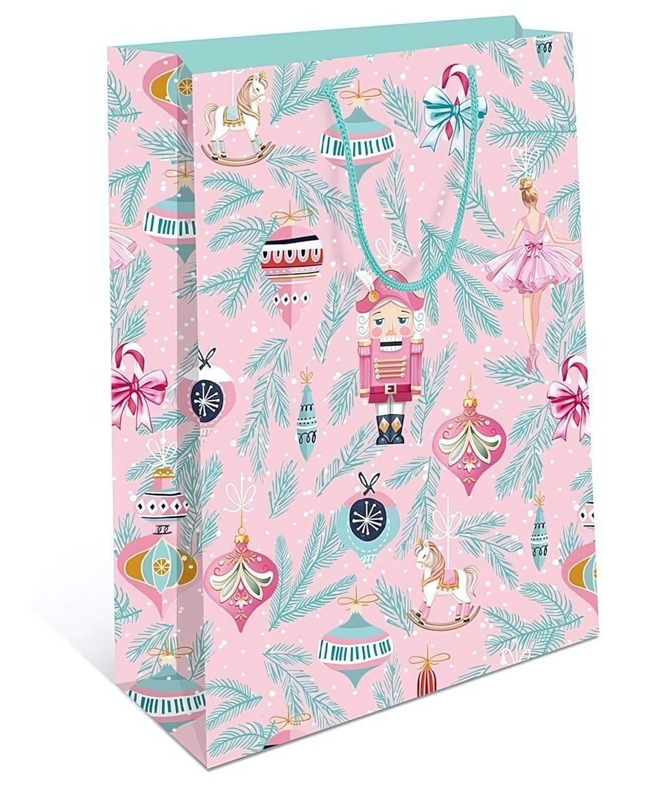 Этот очаровательный новогодний пакет станет идеальным дополнением к вашему подарку, добавив ему праздничное настроение и нотку волшебства. Розовый фон с уникальным узором из новогодних игрушек, гирлянд и сказочных персонажей создаст незабываемое впечатление.