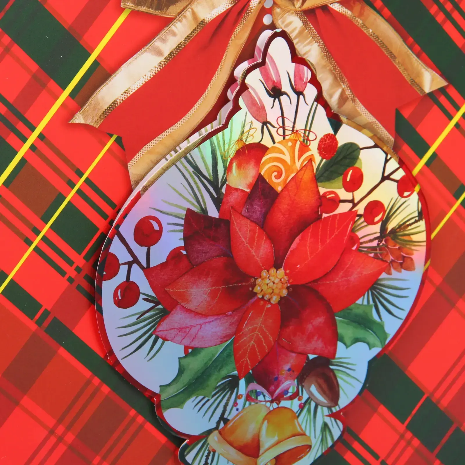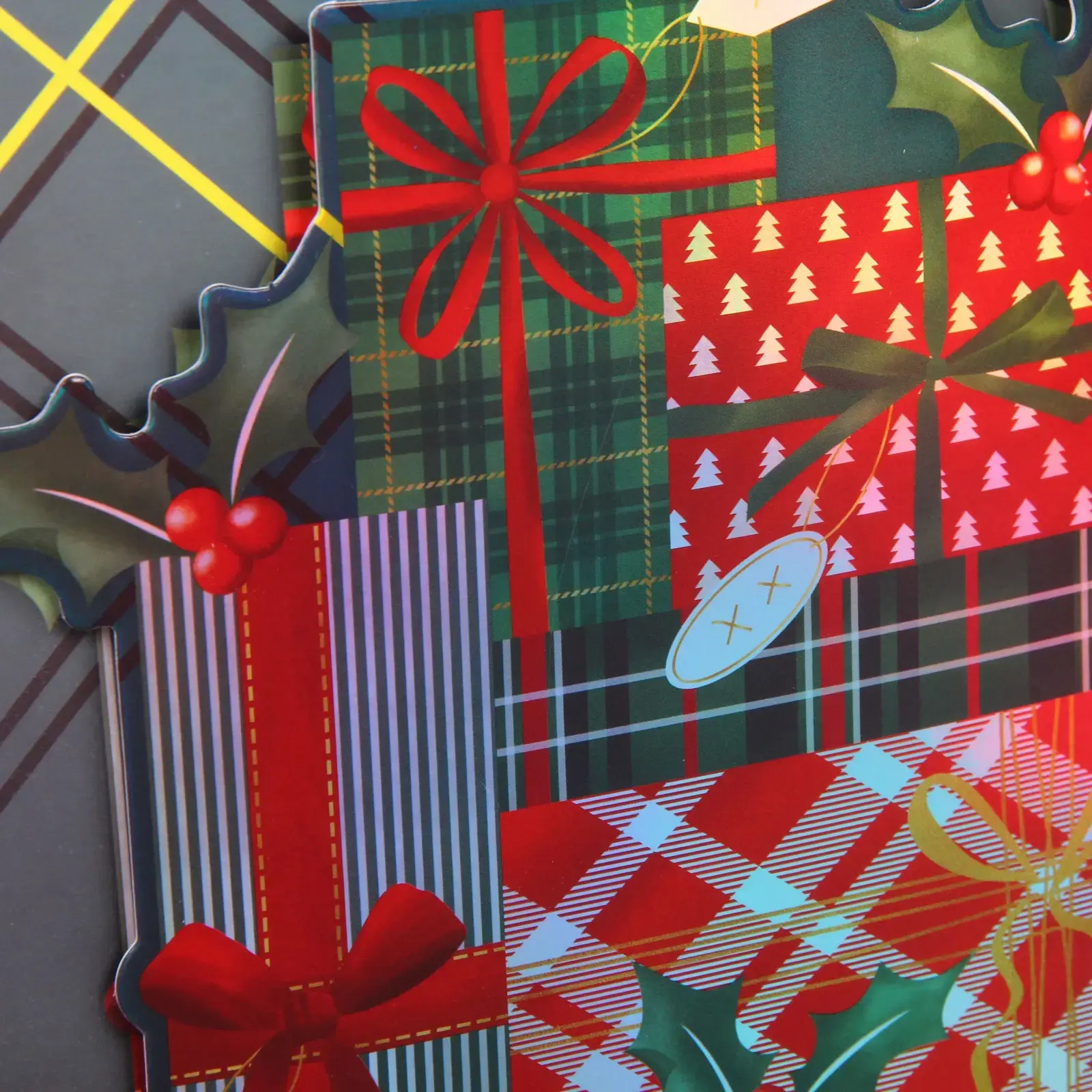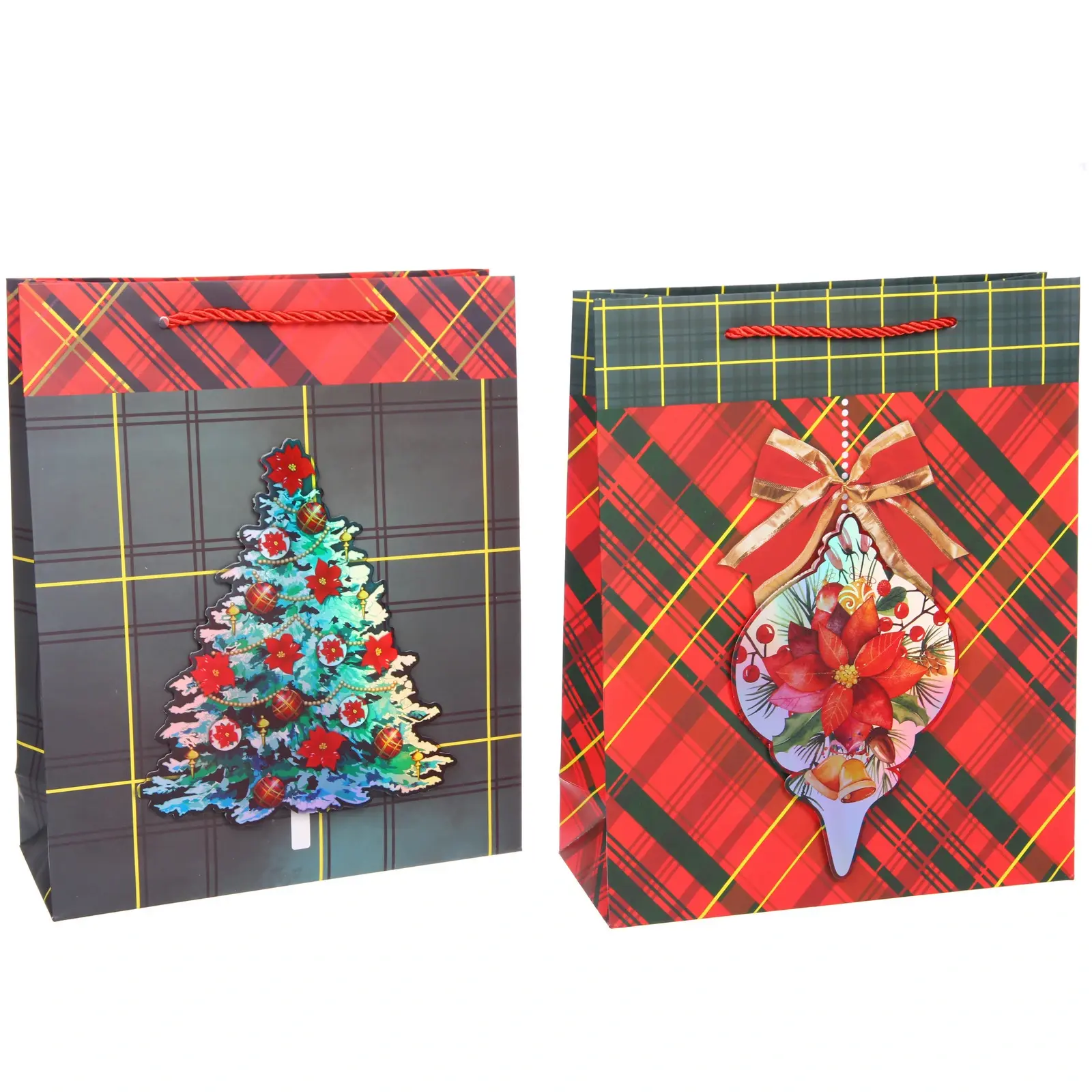 Каждый пакет украшен тематическими принтами: рождественскими чулками, елочными игрушками, праздничными композициями и новогодними мотивами. Черно-красная клетка в сочетании с яркими акцентами создает неповторимую праздничную атмосферу.