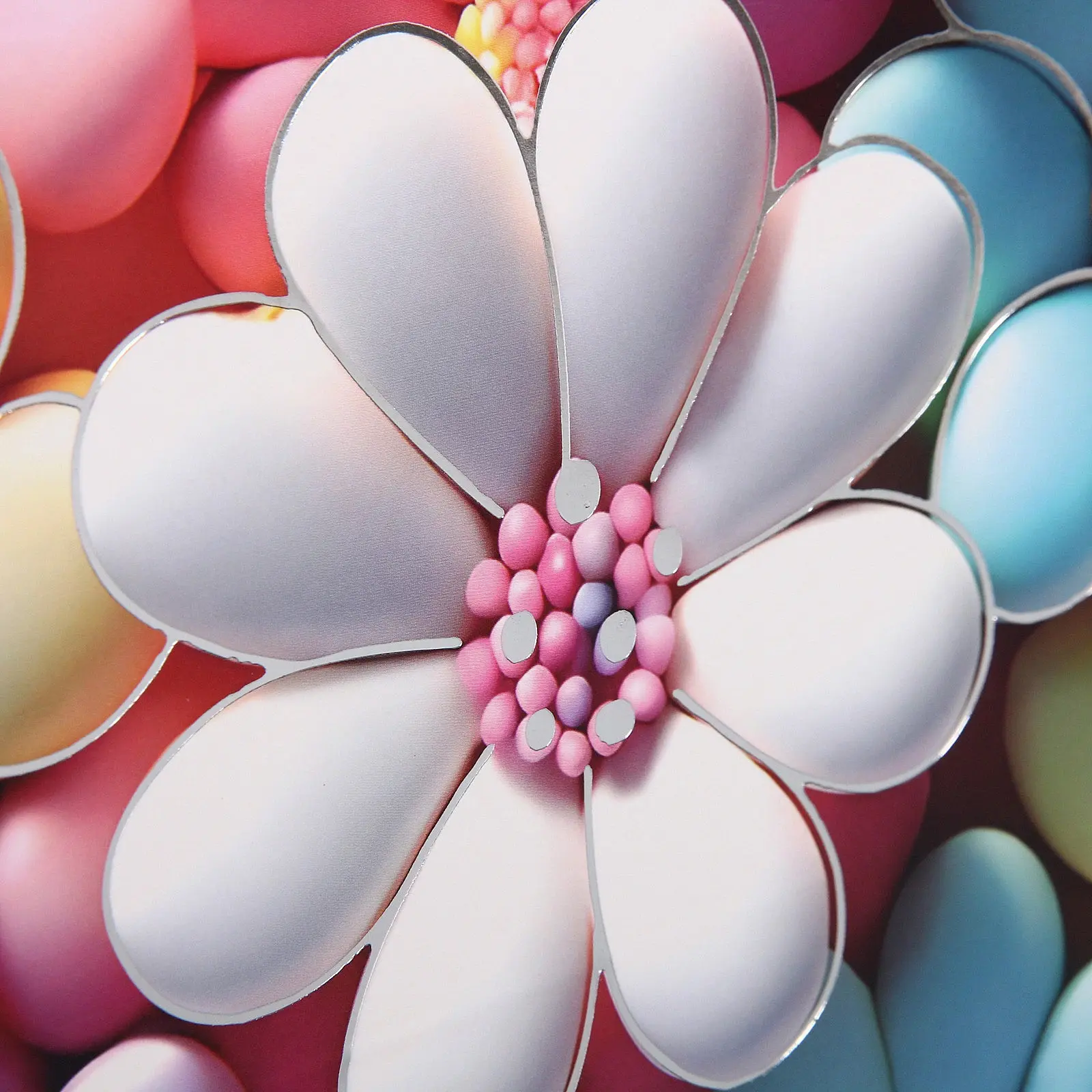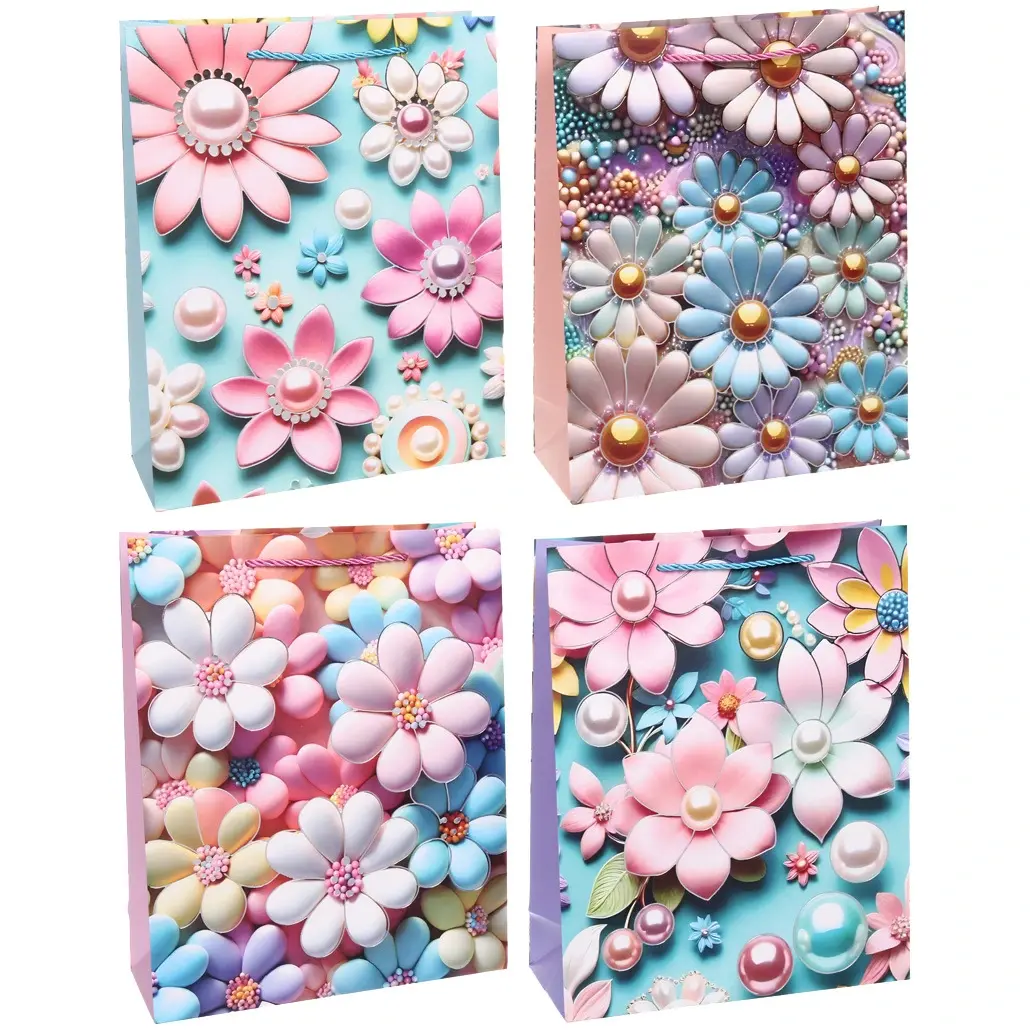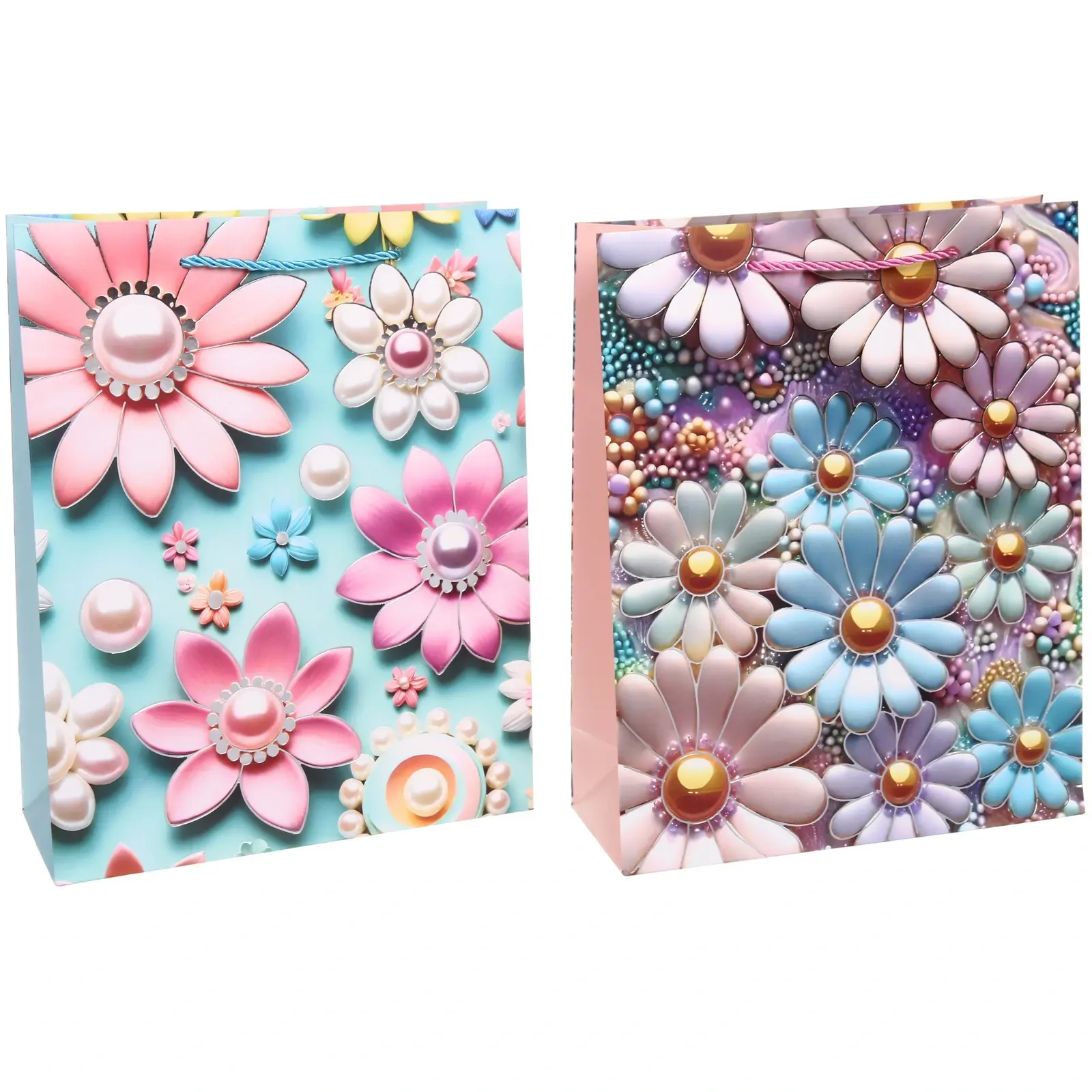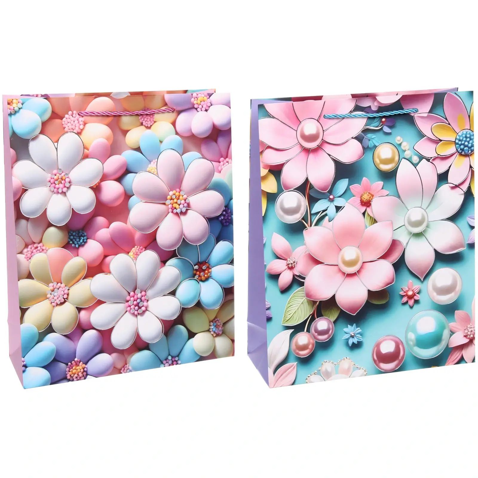Объемные украшения и перламутровые вставки создают эффект роскоши и праздничного настроения. В комплект входит один пакет, оформленный в пастельных оттенках с цветочными мотивами и декоративными элементами, что делает его идеальным выбором для любого торжества или праздника, требующего красивой упаковки.