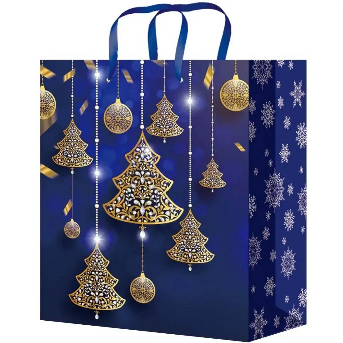 Этот эффектный подарочный пакет с глянцевой ламинацией станет идеальным способом преподнести подарок и подчеркнуть его значимость. Глубокий насыщенный синий фон в сочетании с золотыми ёлками и изящными декоративными элементами создаёт атмосферу праздника и роскоши.