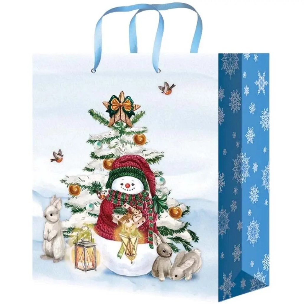 Этот подарочный пакет с глянцевой ламинацией станет неотъемлемой частью вашего праздничного оформления. Яркий новогодний сюжет с нарядной елью, снеговиком в красной шапке и милыми зайцами создаёт тёплую атмосферу ожидания чудес. Пакет впечатляет не только рисунком, но и удобством использования — он идеально подходит для новогодних подарков любого размера, соответствующего его габаритам.