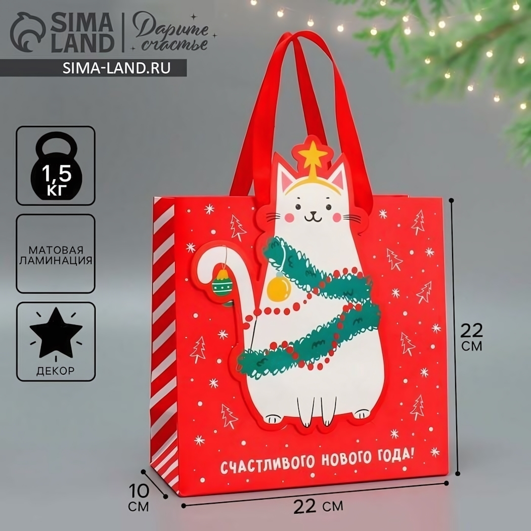Коробка имеет квадратную форму с габаритами 22×22×10 см. Декоративные элементы включают новогодние рисунки: ёлочки, снежинки и забавного кота с гирляндой. Матовая поверхность придает упаковке благородный вид и защищает от отпечатков пальцев.