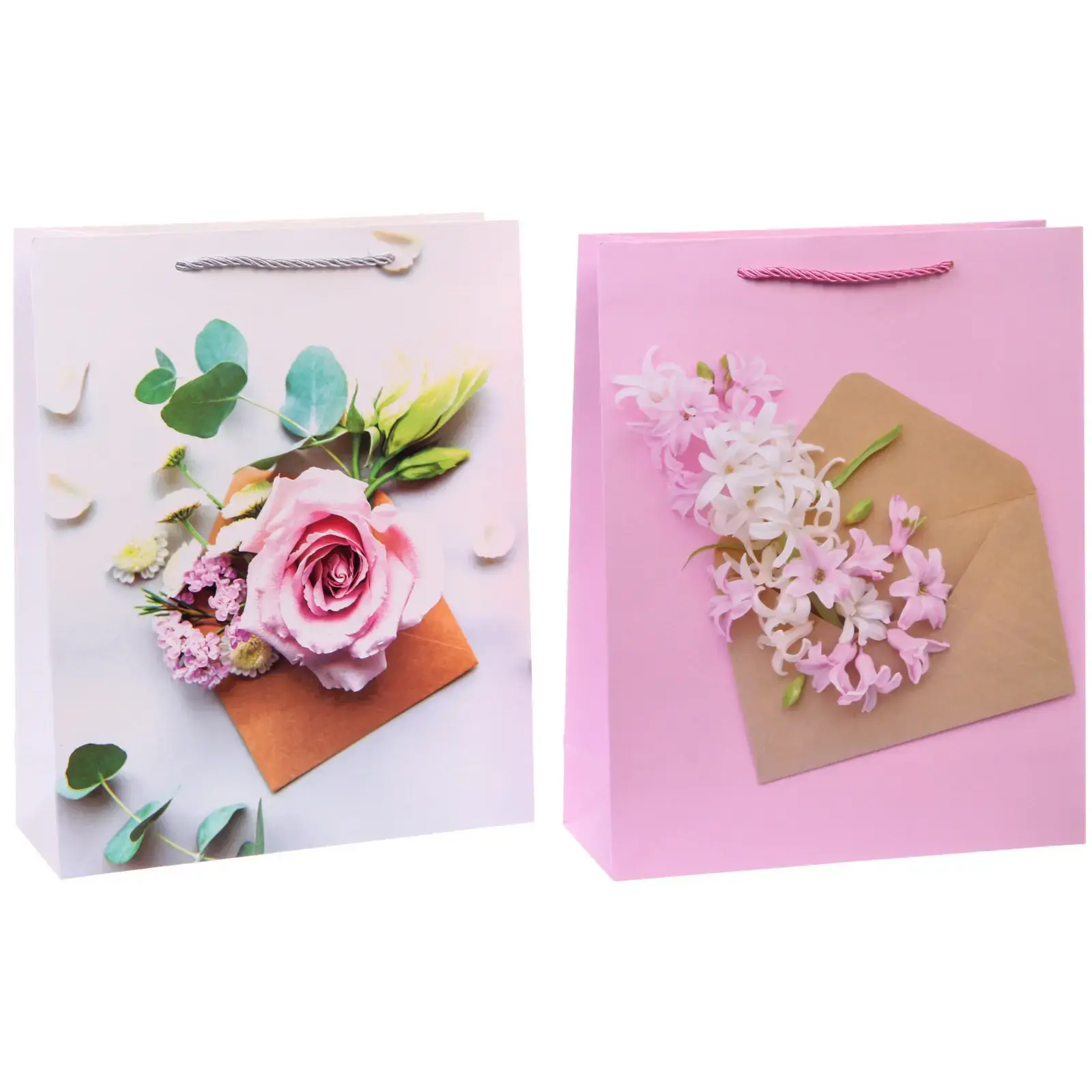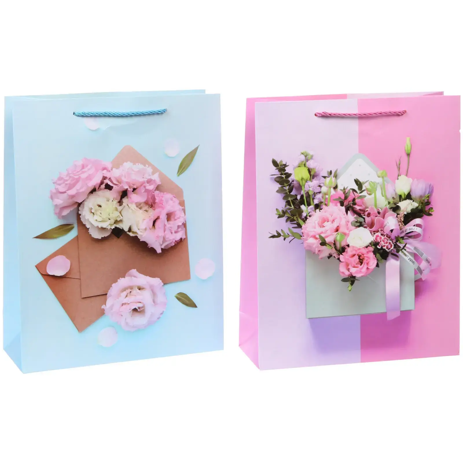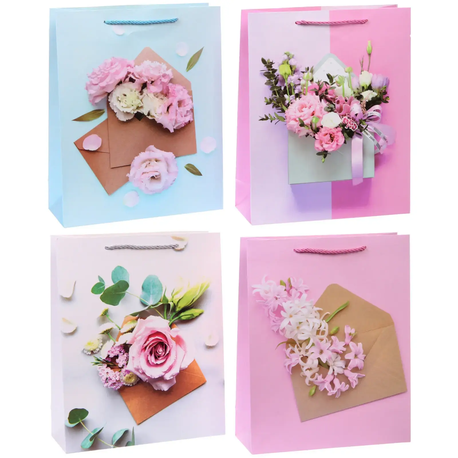 Пакеты представлены в приятной цветовой гамме (голубой, розовый) и декорированы изображениями цветов и конвертов, что делает их идеальным выбором для праздничных мероприятий, дней рождения или романтических сюрпризов.