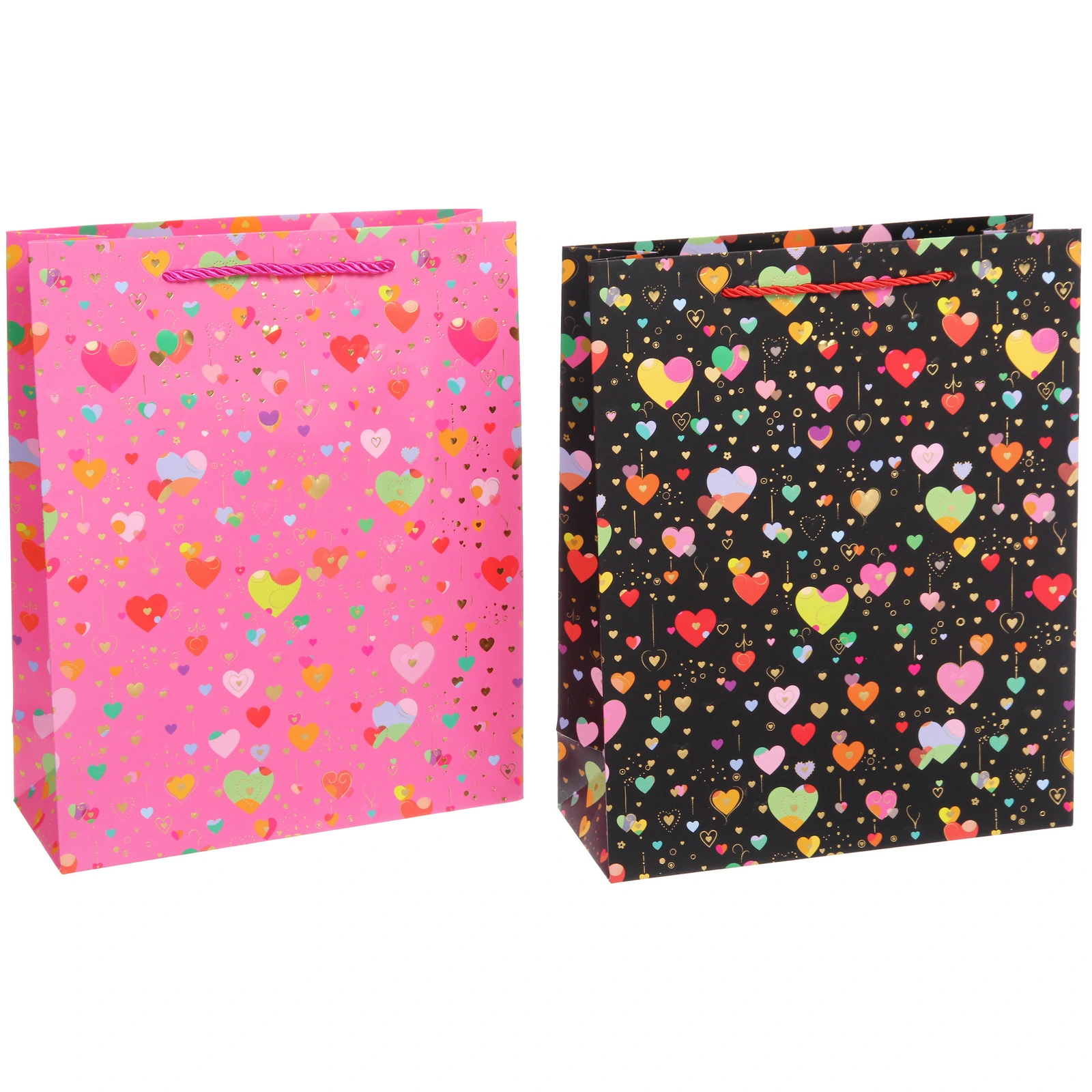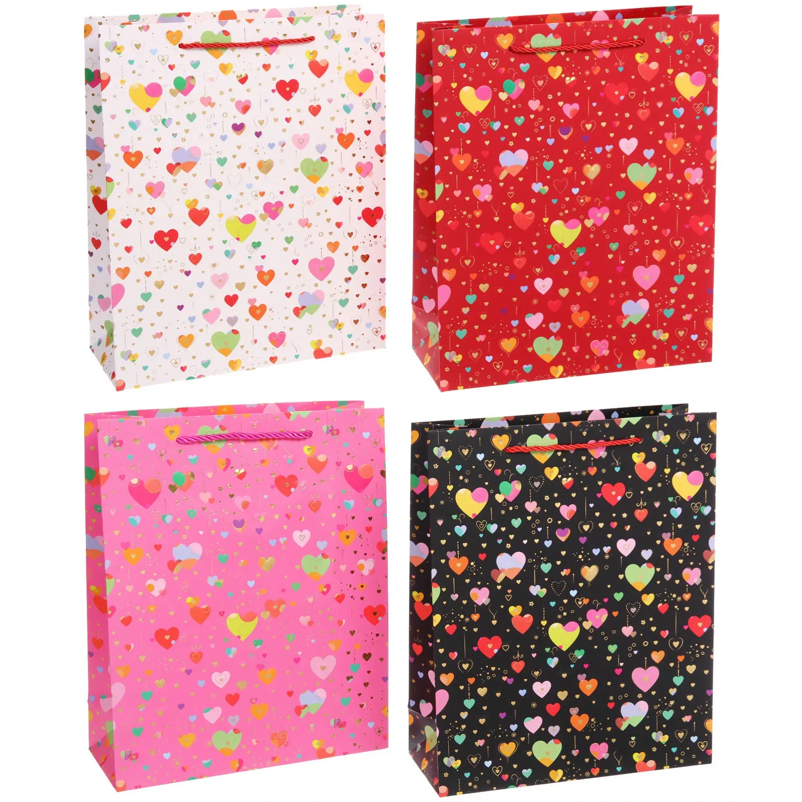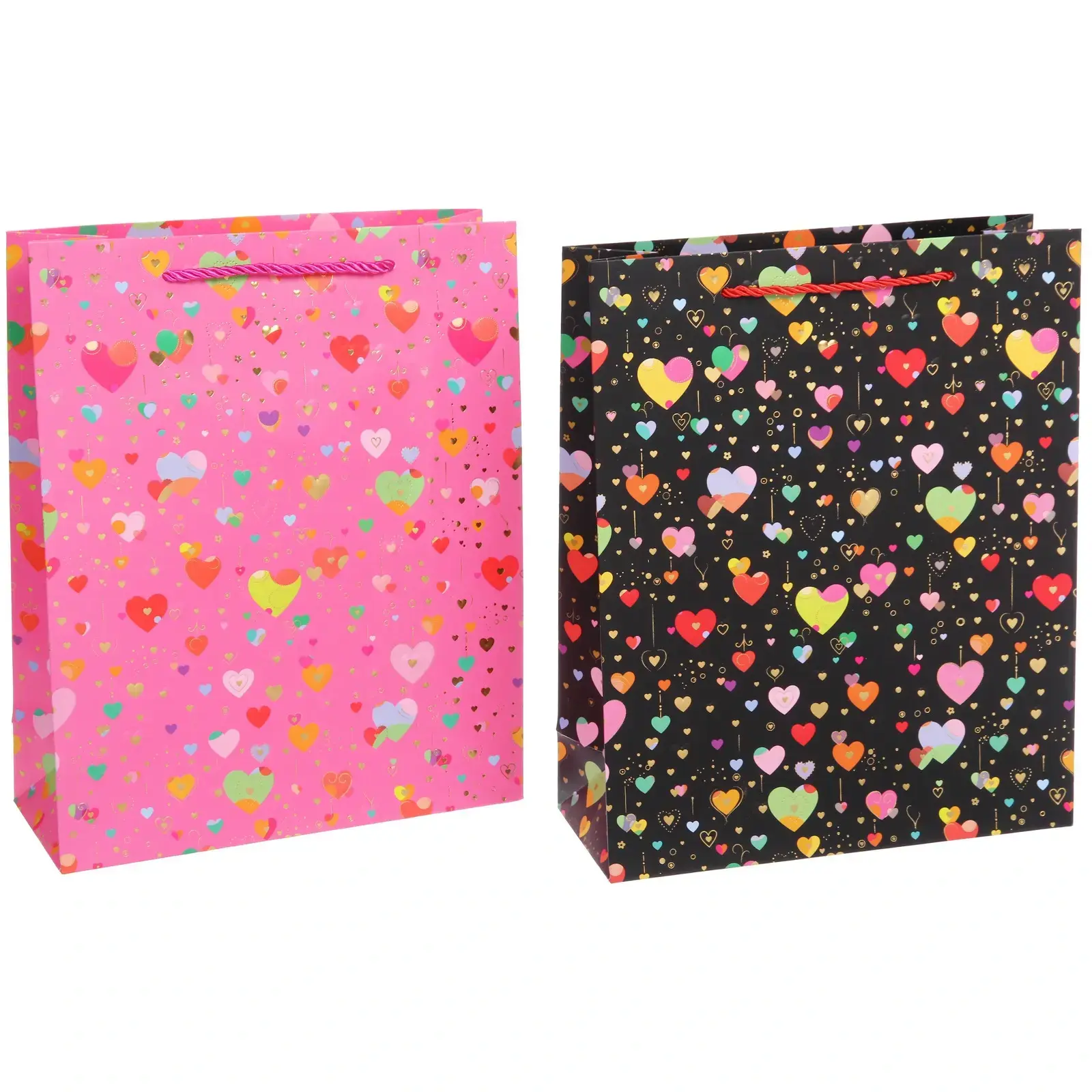 Пакет украшен множеством разноцветных сердечек, которые мгновенно создают праздничное и романтическое настроение. Яркие оттенки розового, красного, зеленого, желтого, голубого и оранжевого на глянцевой поверхности бумаги делают каждый пакет настоящим арт-объектом. Дизайн, в котором сердечки разбросаны в случайном порядке, придает пакету динамичность и уникальность, делая его привлекательным для получателя любого возраста.