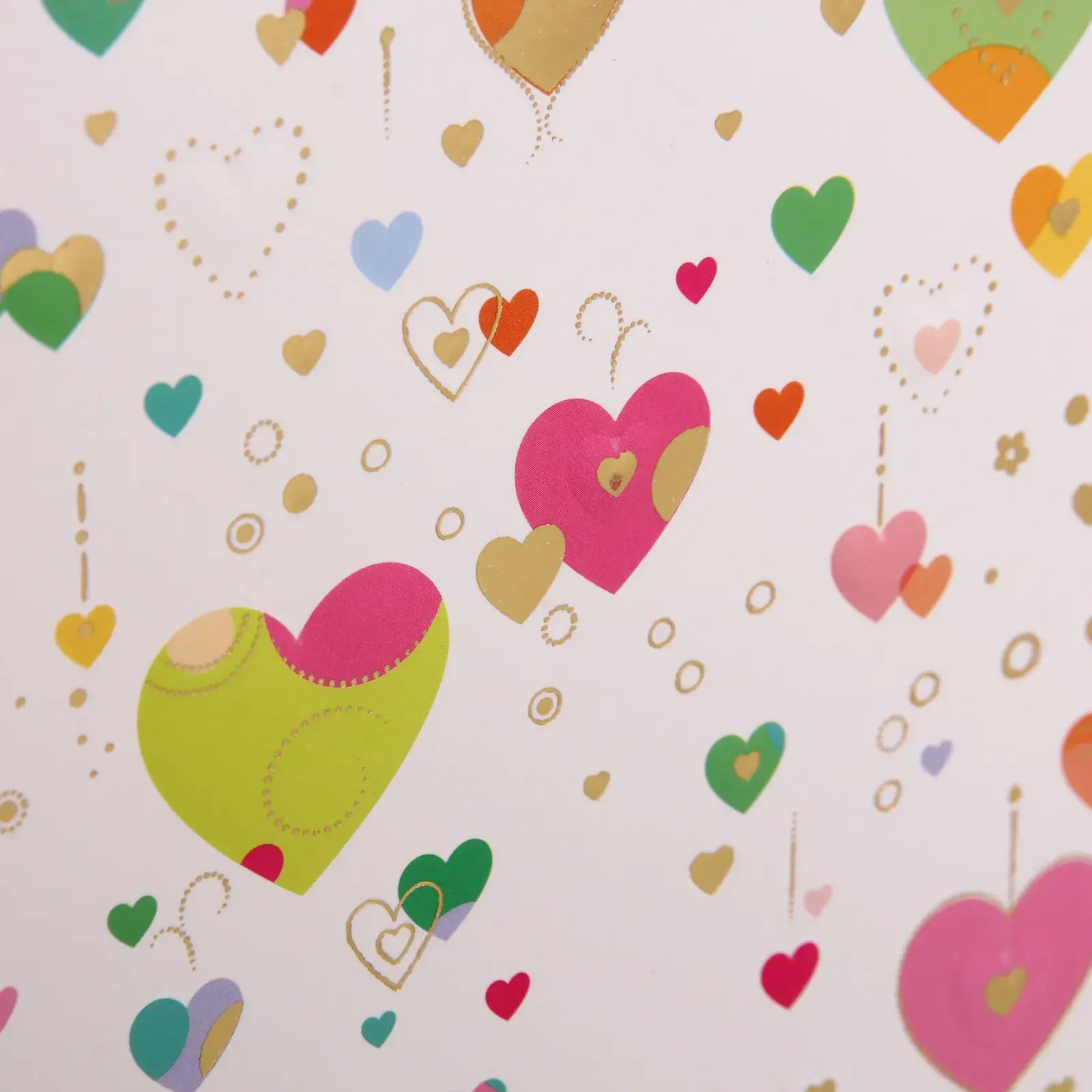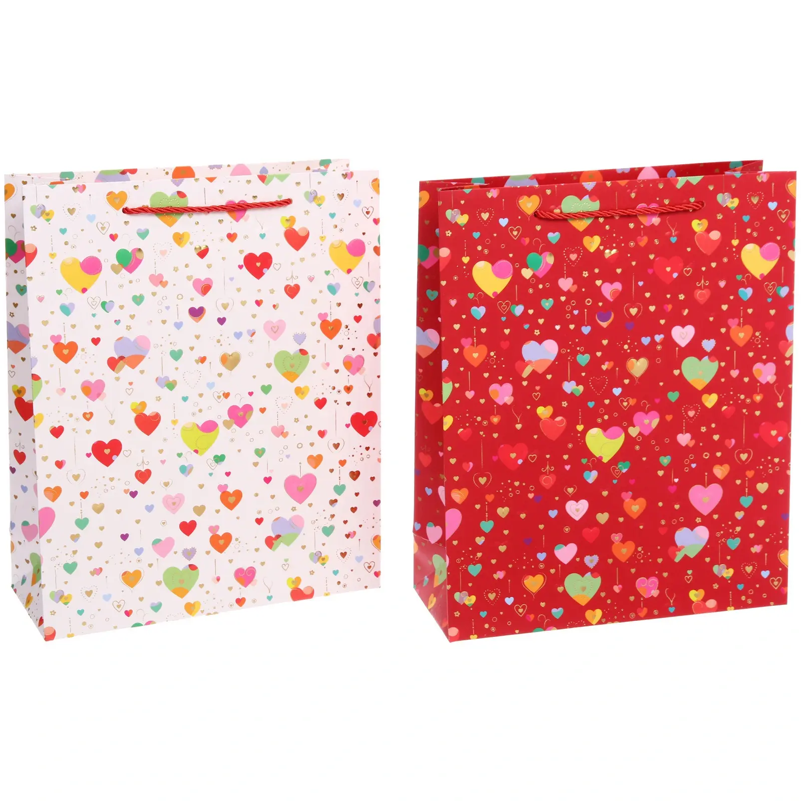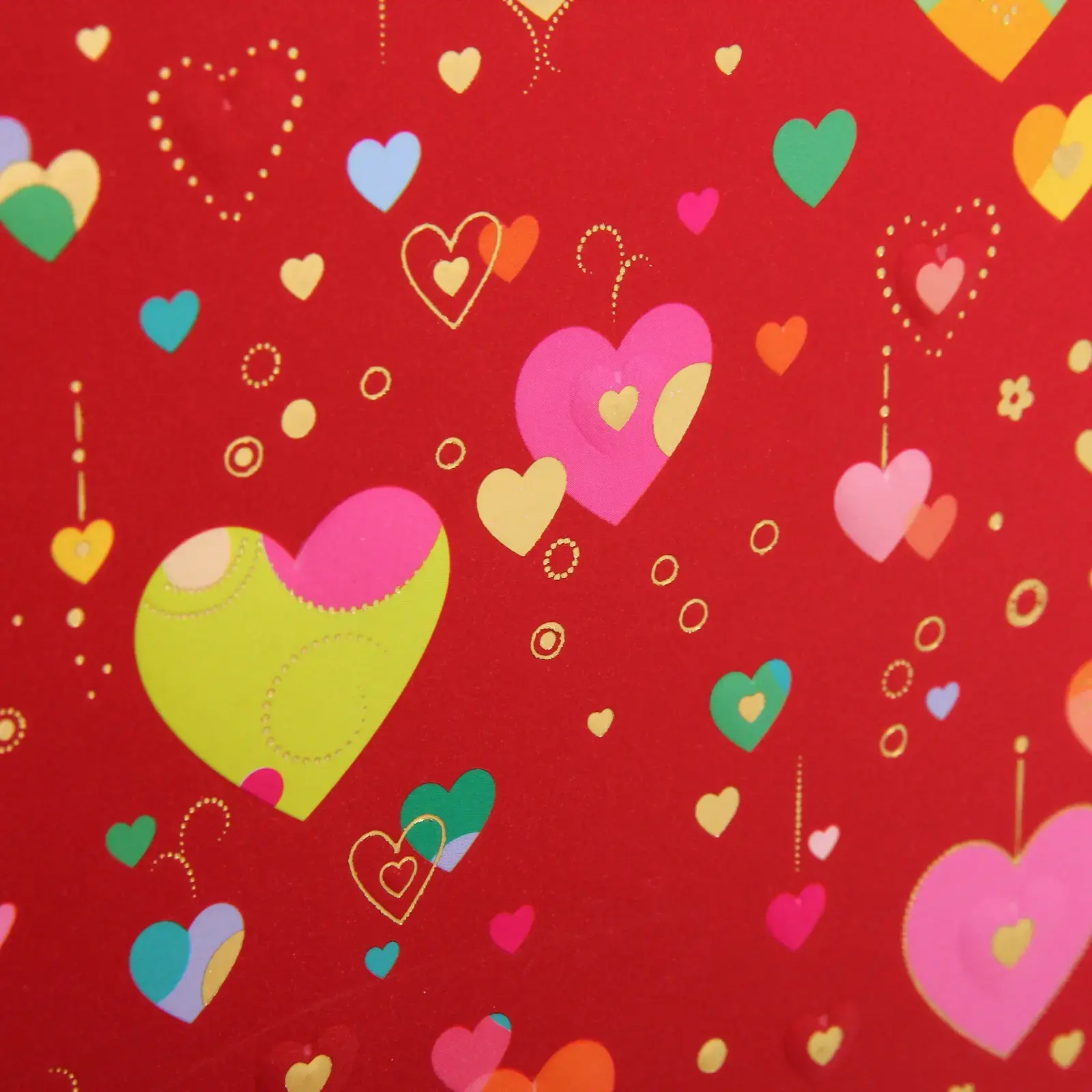 Пакет украшен множеством разноцветных сердечек, которые мгновенно создают праздничное и романтическое настроение. Яркие оттенки розового, красного, зеленого, желтого, голубого и оранжевого на глянцевой поверхности бумаги делают каждый пакет настоящим арт-объектом. Дизайн, в котором сердечки разбросаны в случайном порядке, придает пакету динамичность и уникальность, делая его привлекательным для получателя любого возраста.