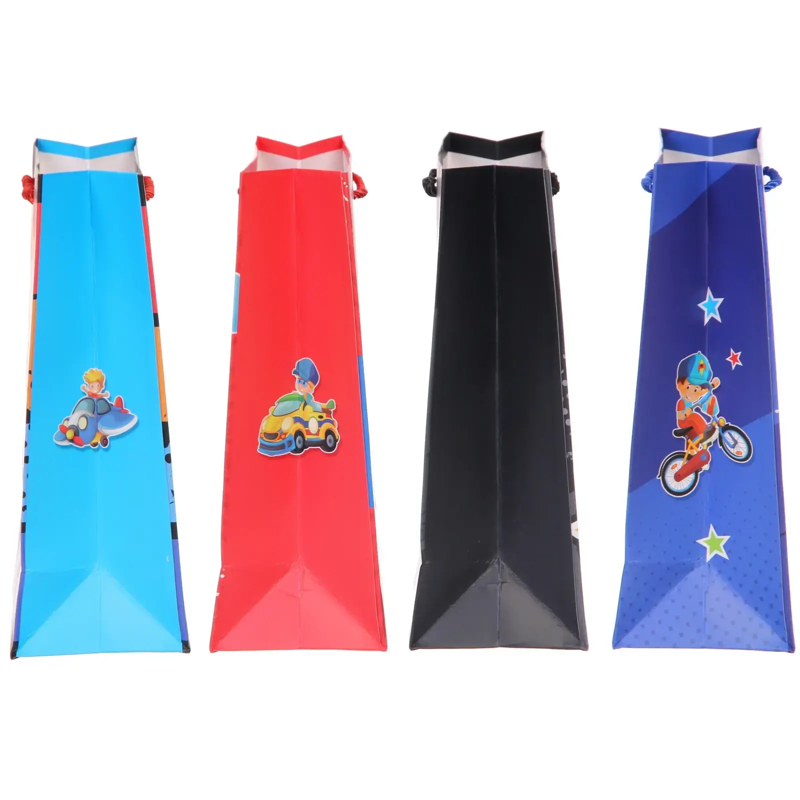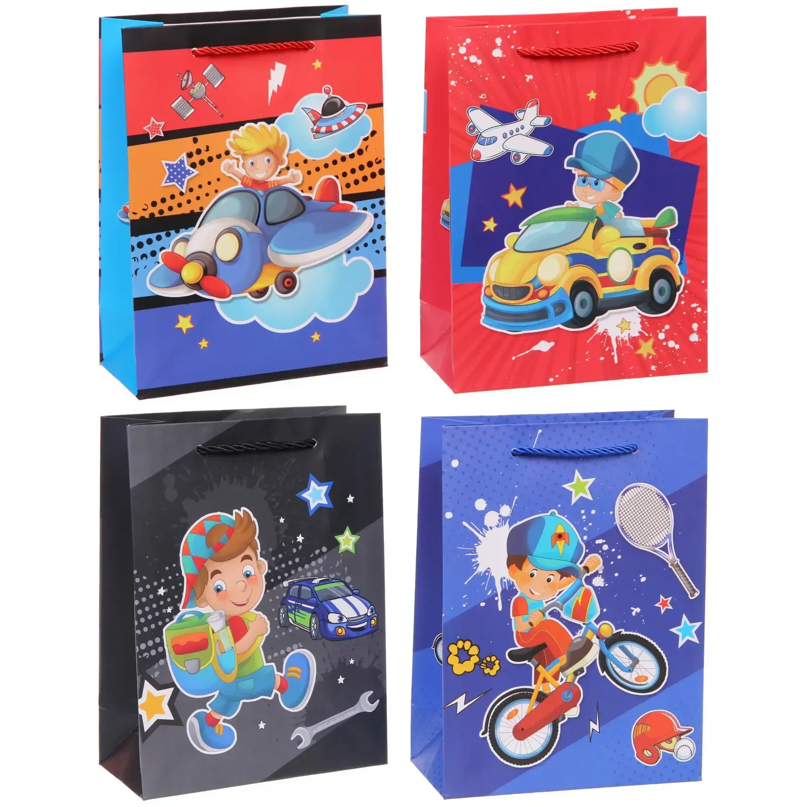 Размер пакета — 18*24*8,5 см, что идеально для средних подарков. Дизайн включает четыре варианта с изображениями самолётов, машин, инструментов и спортивных элементов.