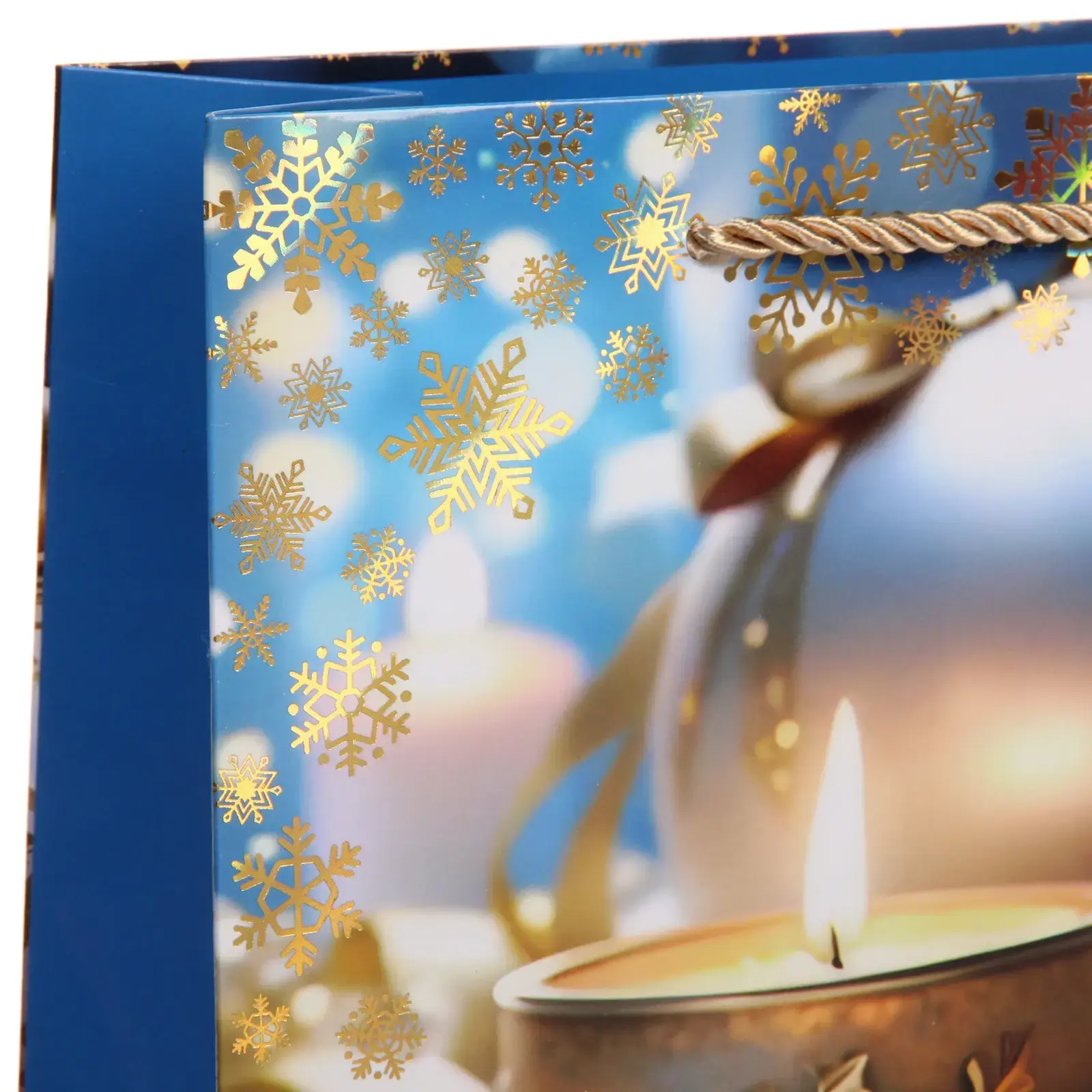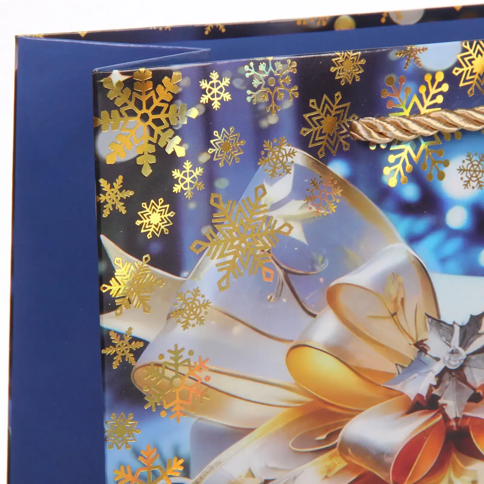 Изготовленный из качественной бумаги, пакет обладает глянцевой поверхностью, что придает ему дополнительный блеск. Декоративные элементы, такие как золотые снежинки и звезды, делают его еще более привлекательным. Пакет доступен в различных цветах, включая оранжевый и синий, что позволяет выбрать именно тот, который подойдет к вашему подарку.