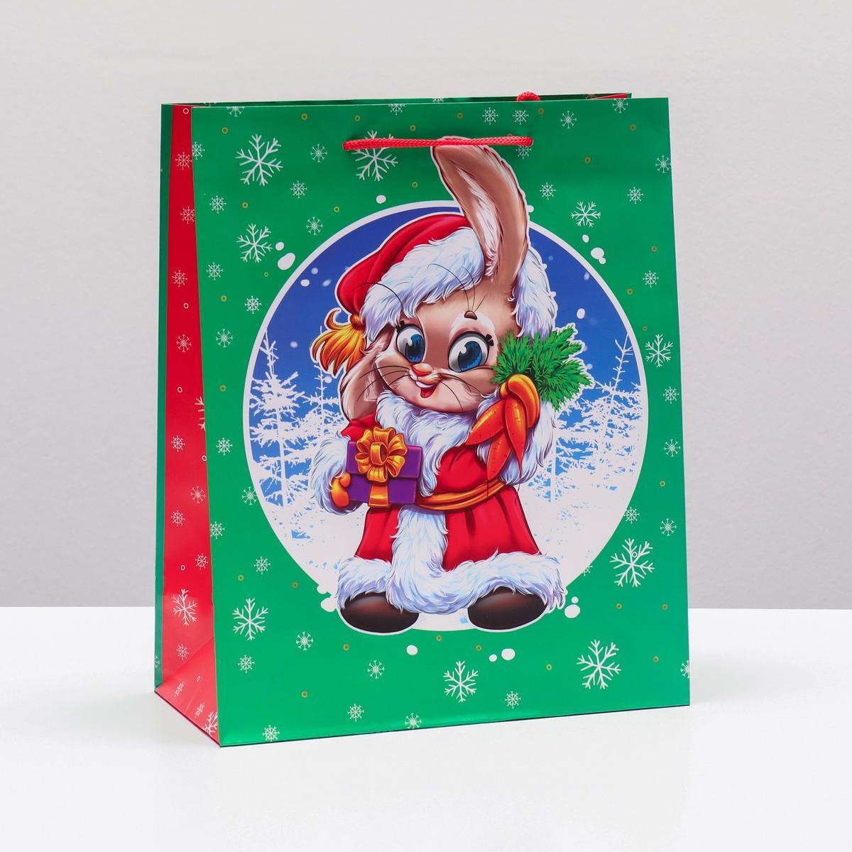 Новогодний подарочный пакет с очаровательным дизайном станет завершающим штрихом вашего сюрприза. Яркое сочетание зеленого фона, красных акцентов и снежных узоров создаёт атмосферу зимней сказки, а милый зайчик в праздничном наряде добавит тепла каждому подарку.