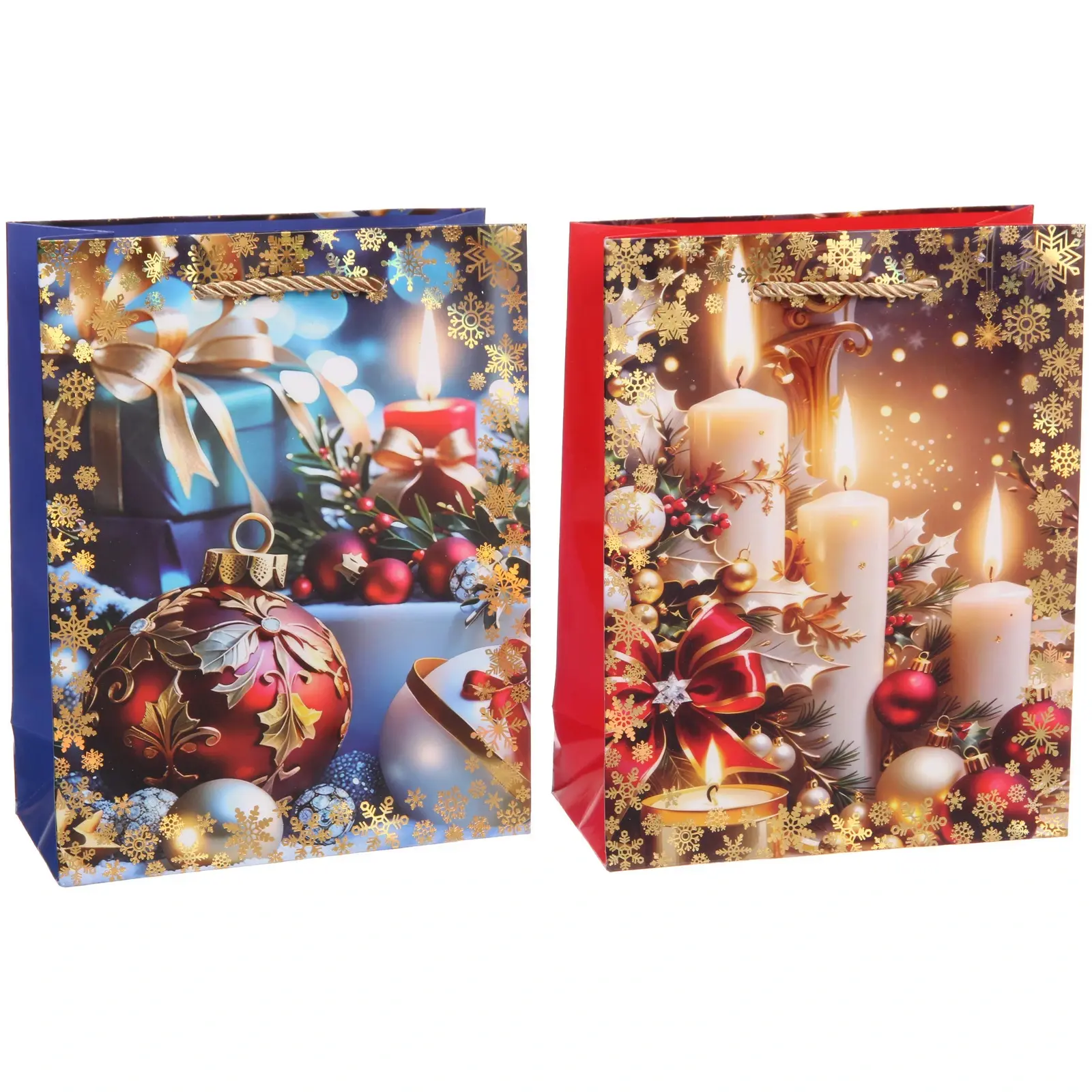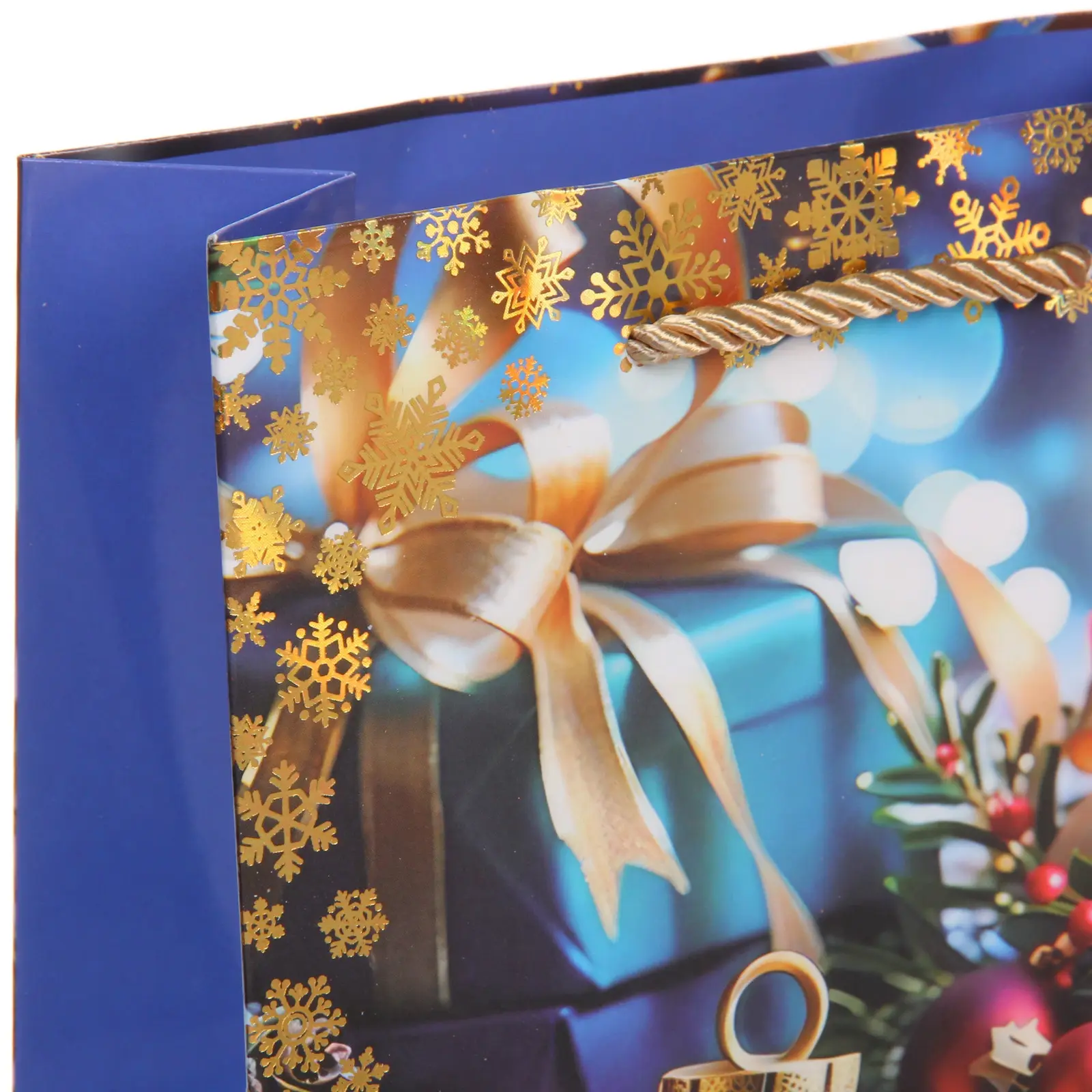 Размер пакета составляет 18х23х8 см, что делает его универсальным для различных подарков. Он доступен в двух цветах: красном и синем, что позволяет выбрать наиболее подходящий вариант для вашего подарка. Пакет оформлен золотыми узорами и снежинками, что добавляет ему изысканности и стиля.