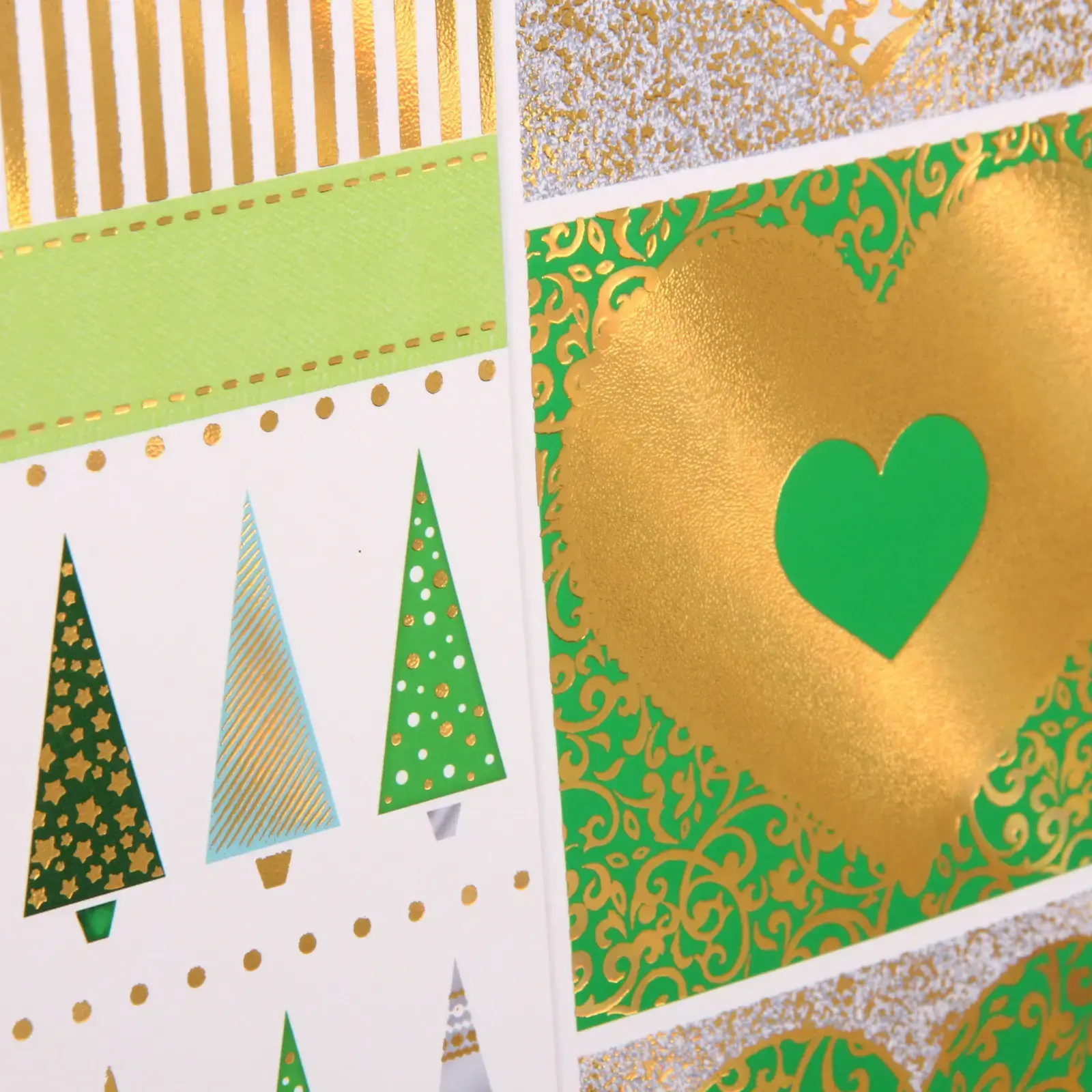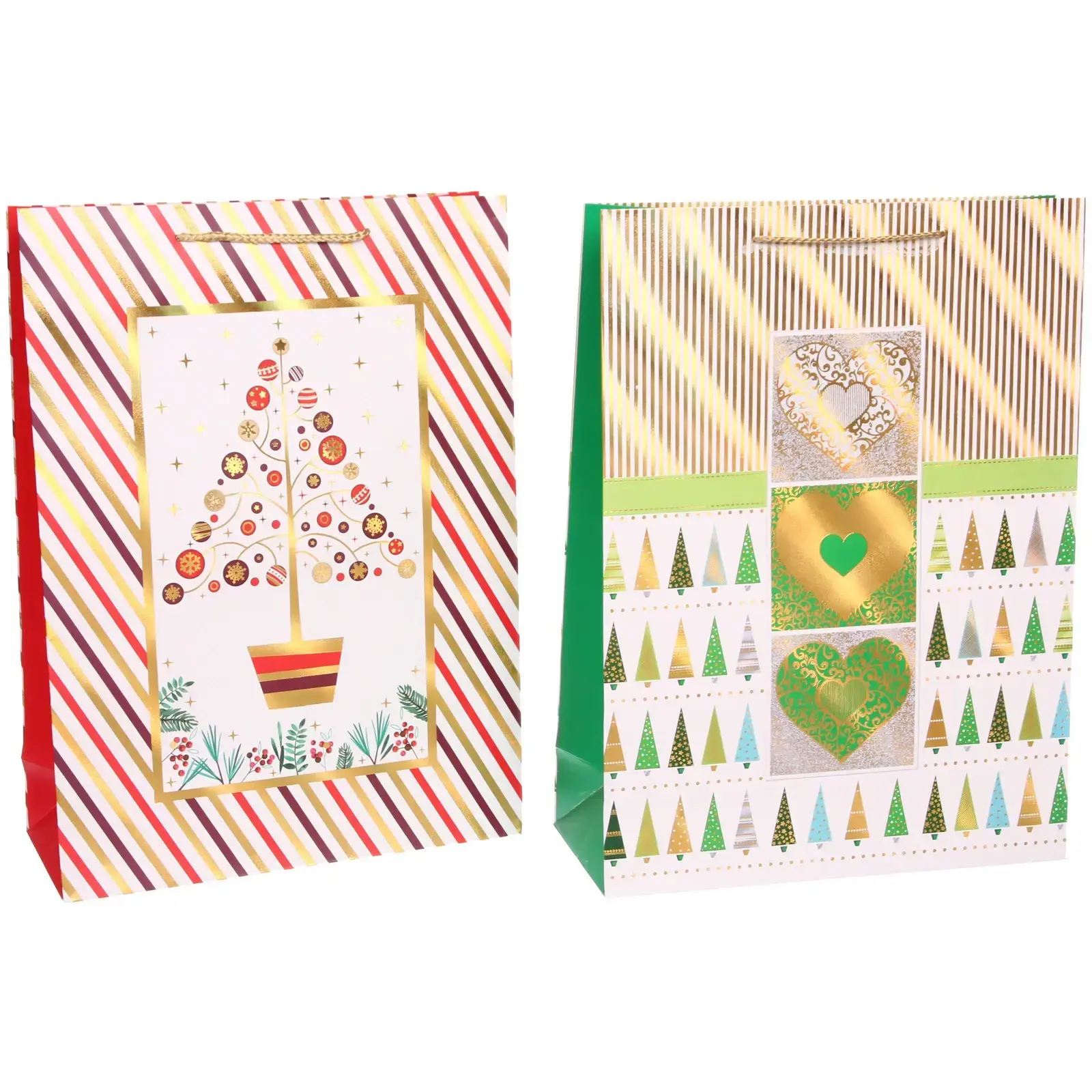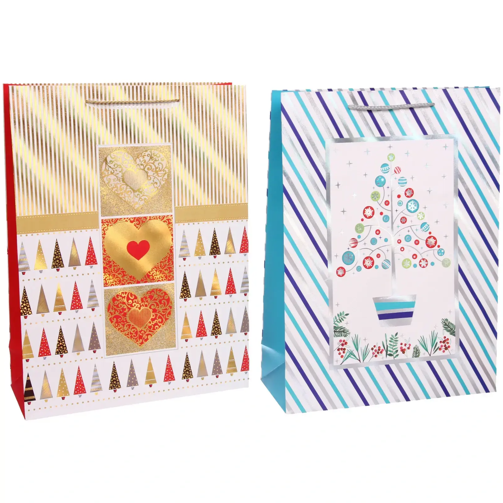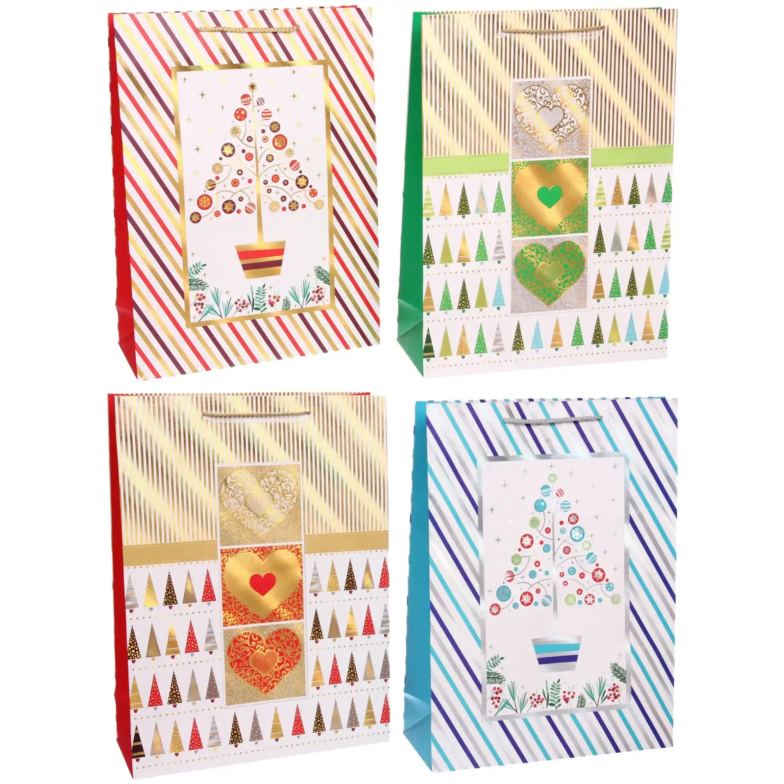 Каждый пакет украшен тематическими рисунками: новогодние ели, декоративные сердечки и геометрические узоры. Золотистые и серебристые элементы создают эффект роскоши, а прочная бумага с матовой текстурой гарантирует сохранность содержимого.
