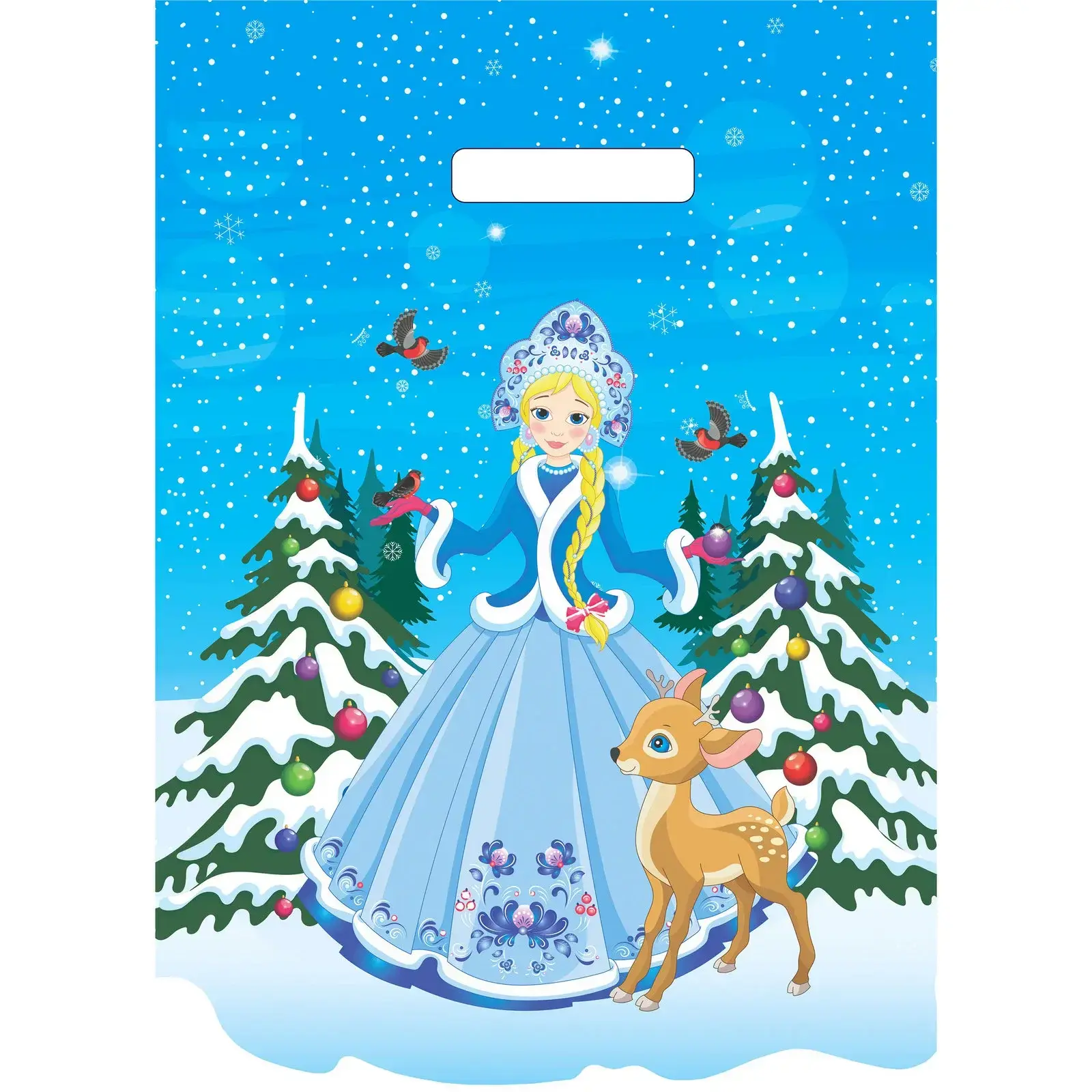 Пакет изготовлен из прочного пластика, что гарантирует его долговечность. Он имеет верхний вырез для ручки, что делает его использование еще более удобным. Стильный рисунок с изображением девушки и олененка добавляет праздничного настроения и делает пакет отличным выбором для новогодних праздников.