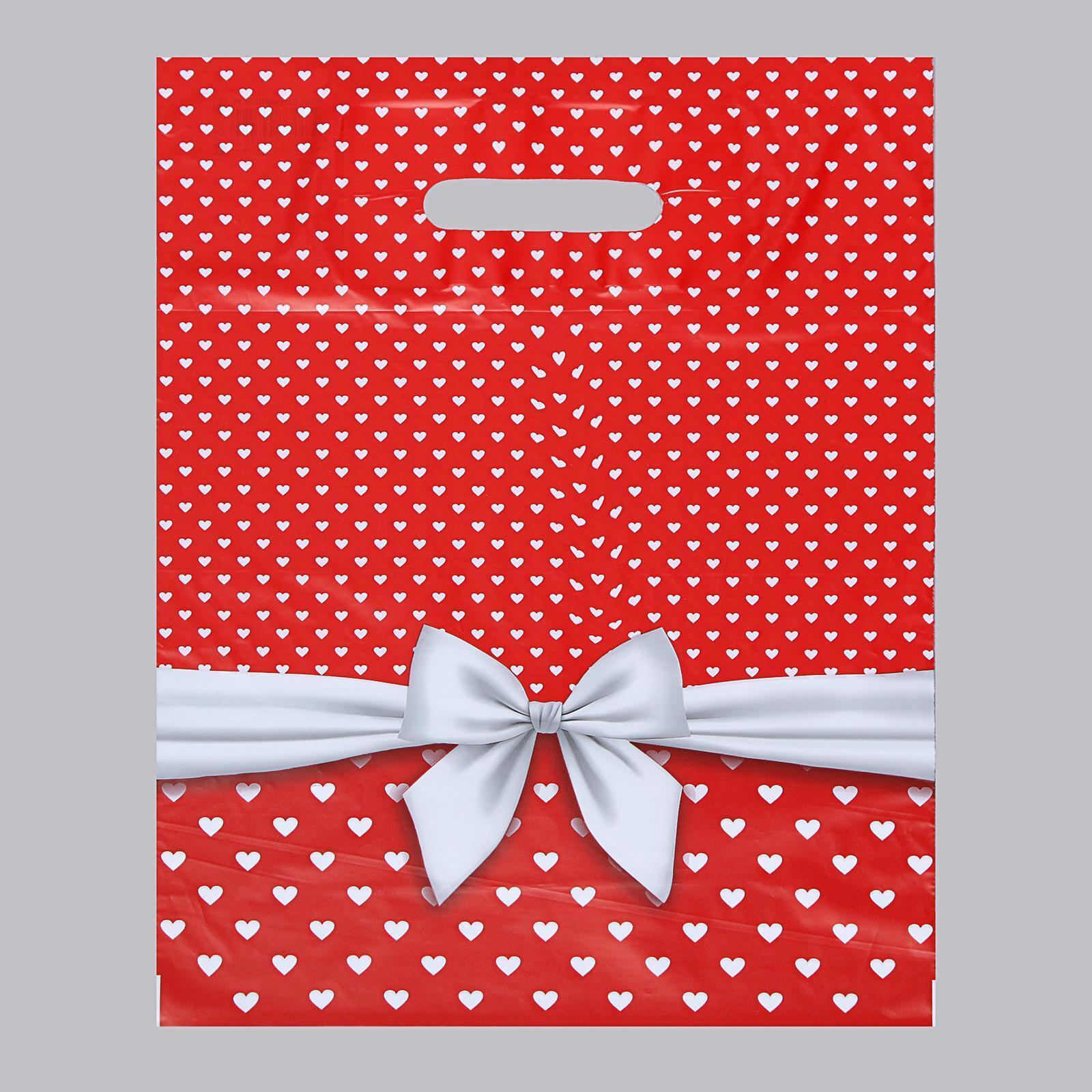 Подарочный пакет «Скарлетт» с вырубной ручкой, 30х38 см, полиэтилен, красный с белыми сердечками