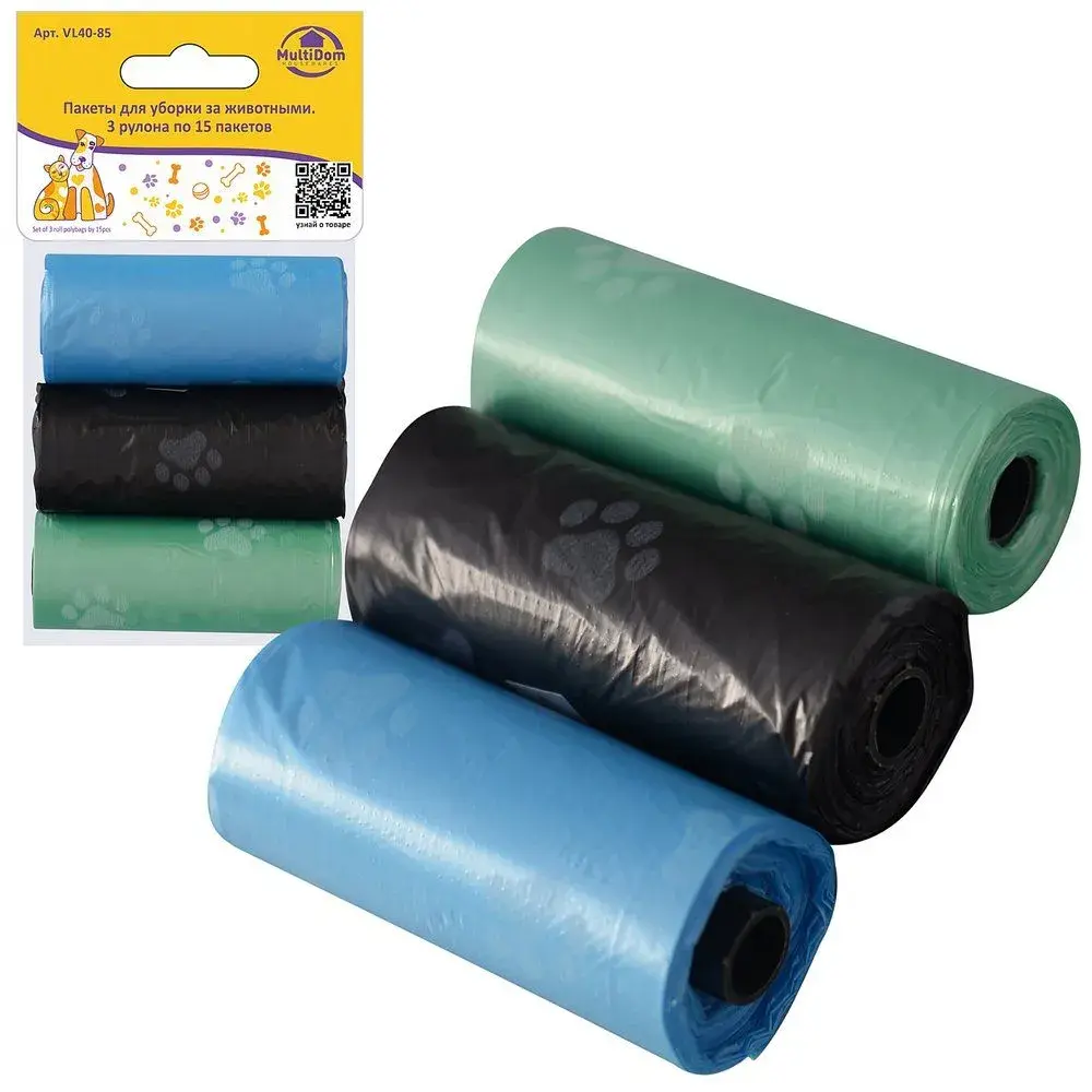 Каждый рулон содержит 15 плотных пакетов с фирменным принтом лапки. Универсальный размер подходит для собак всех пород и кошек. Рулоны разного цвета помогают легко контролировать расход.
