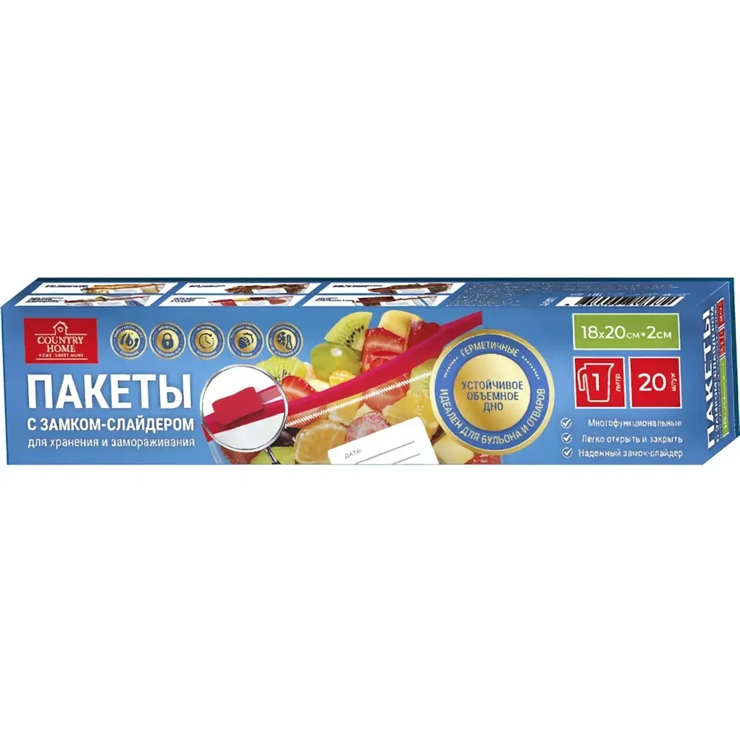 Пакеты-слайдеры «Country Home» — это идеальное решение для хранения и заморозки продуктов. Благодаря специальной застежке-слайдеру, они надежно закрываются, предотвращая вытекание жидкостей и сохраняя свежесть ваших продуктов. Эти пакеты помогут вам организовать пространство в холодильнике и морозильной камере, а также упростят процесс хранения и разморозки.