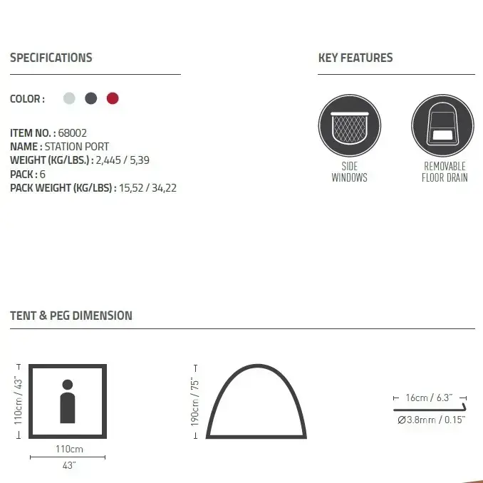 Размеры палатки составляют 110 см в ширину, 110 см в глубину и 190 см в высоту, что обеспечивает достаточно пространства для комфортного переодевания. В комплект входит одна палатка и сумка для переноски, что делает её удобной для транспортировки. С палатку Station Port вы сможете наслаждаться отдыхом на свежем воздухе, не беспокоясь о приватности.