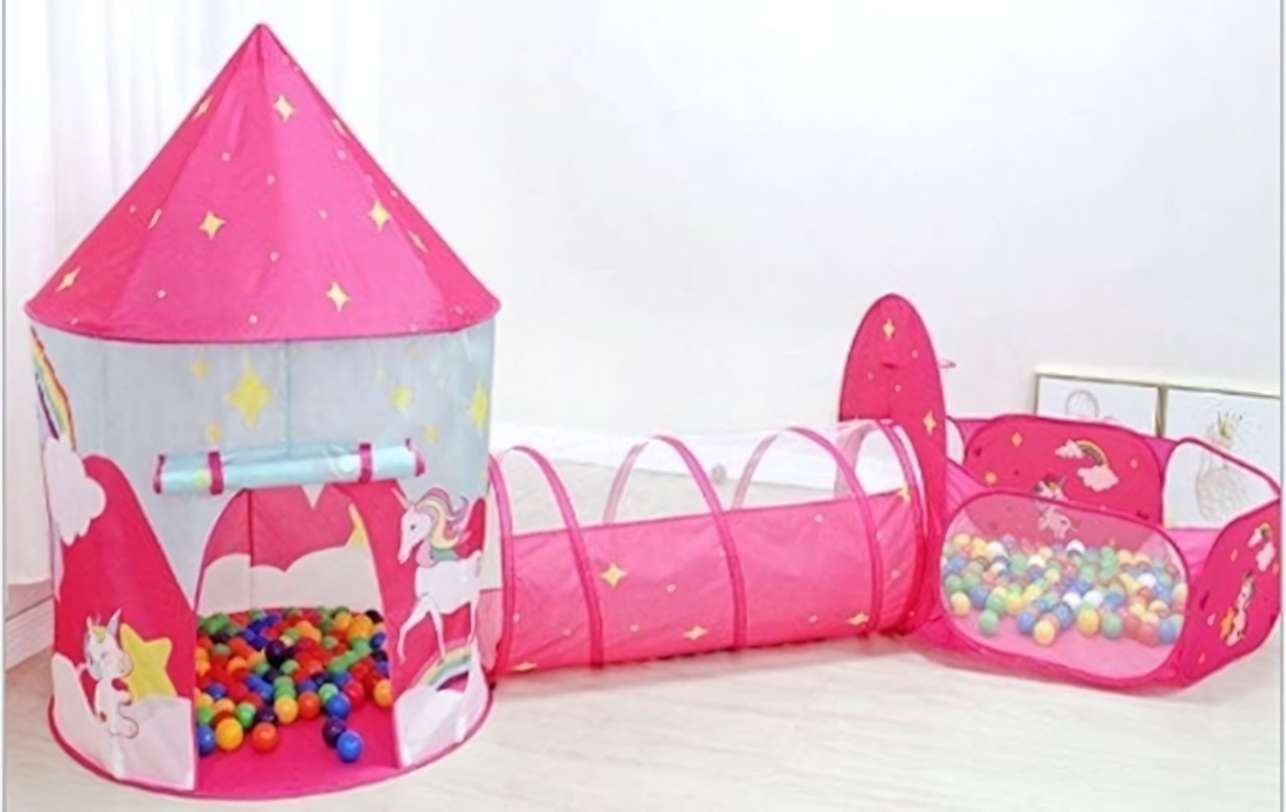 - Многофункциональность: Включает в себя палатку-замок, туннель и бассейн для шариков, предлагая множество вариантов для игр.