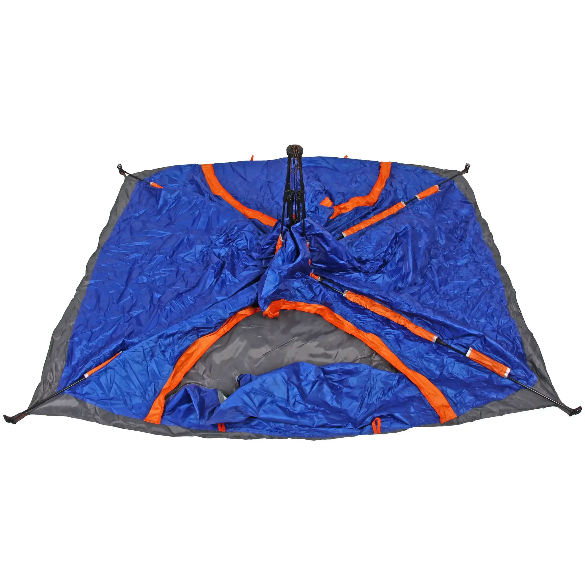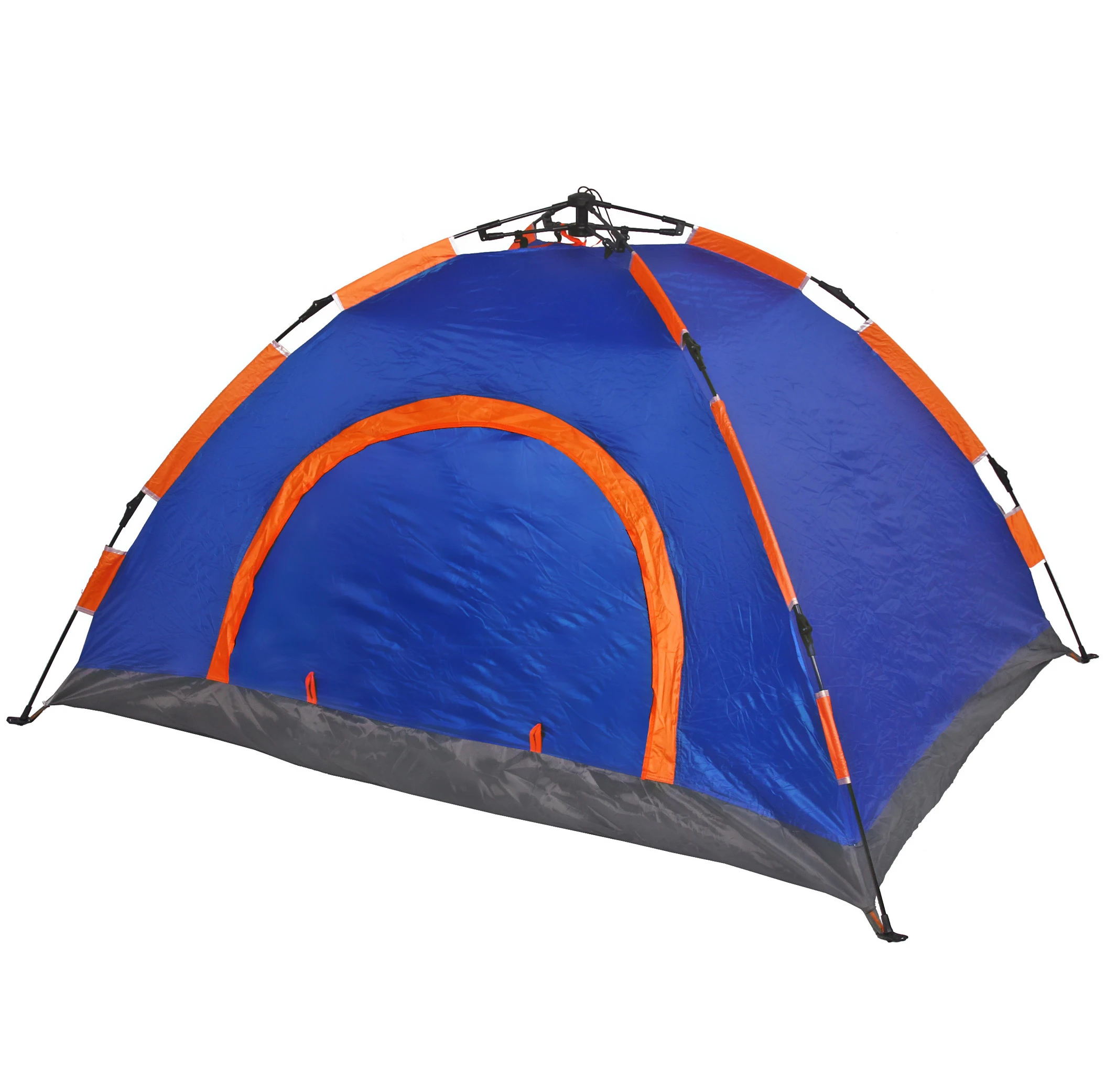 - Синий цвет с оранжевыми и серыми деталями делает палатку стильной и заметной.