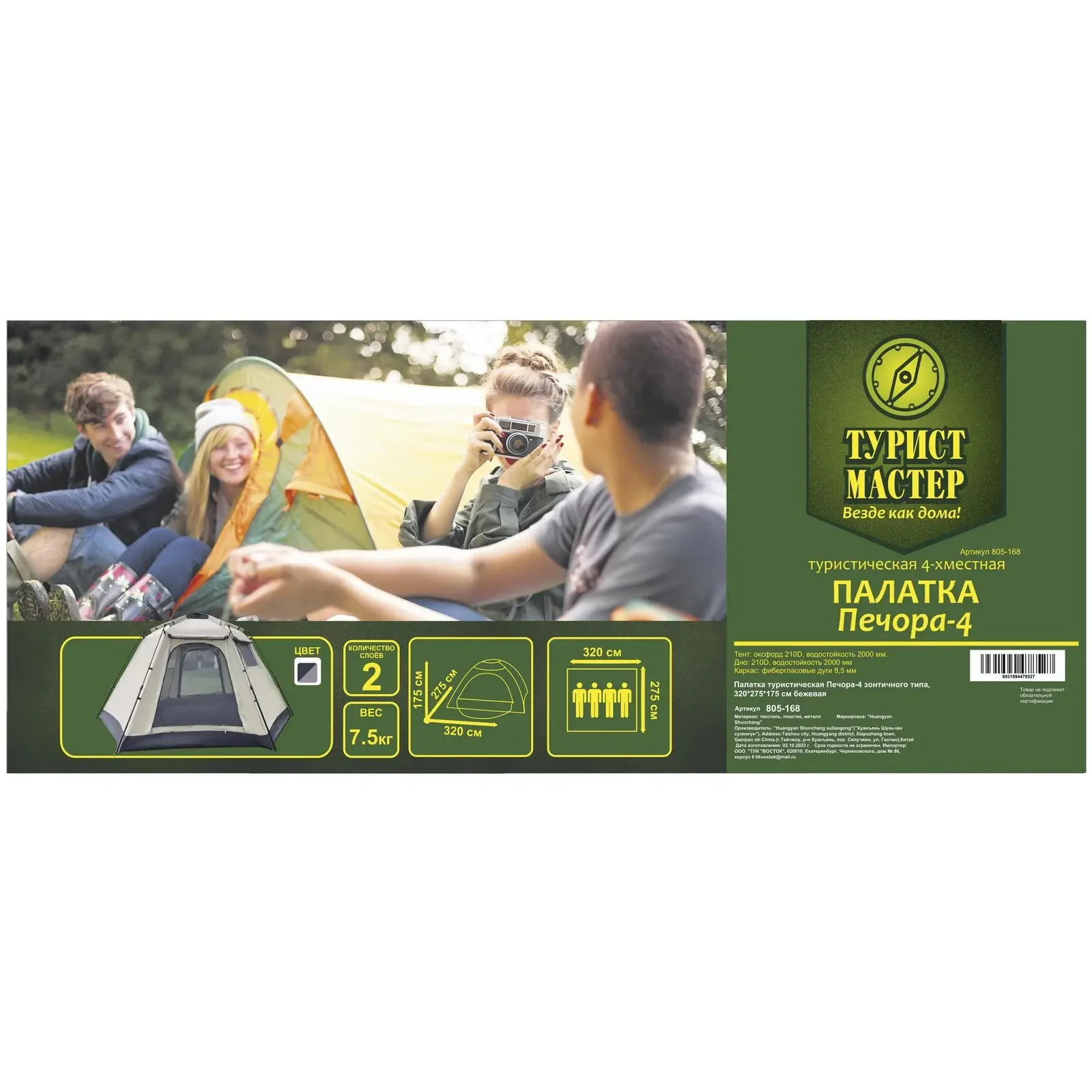 Палатка выполнена из прочного текстиля, который обеспечивает долговечность и надежность. Она легко складывается и помещается в специальный чехол, что делает её удобной для транспортировки. Размеры палатки: 320 см в длину, 275 см в ширину и 175 см в высоту. Вес палатки составляет 7,5 кг, что позволяет легко переносить её в походах и путешествиях.