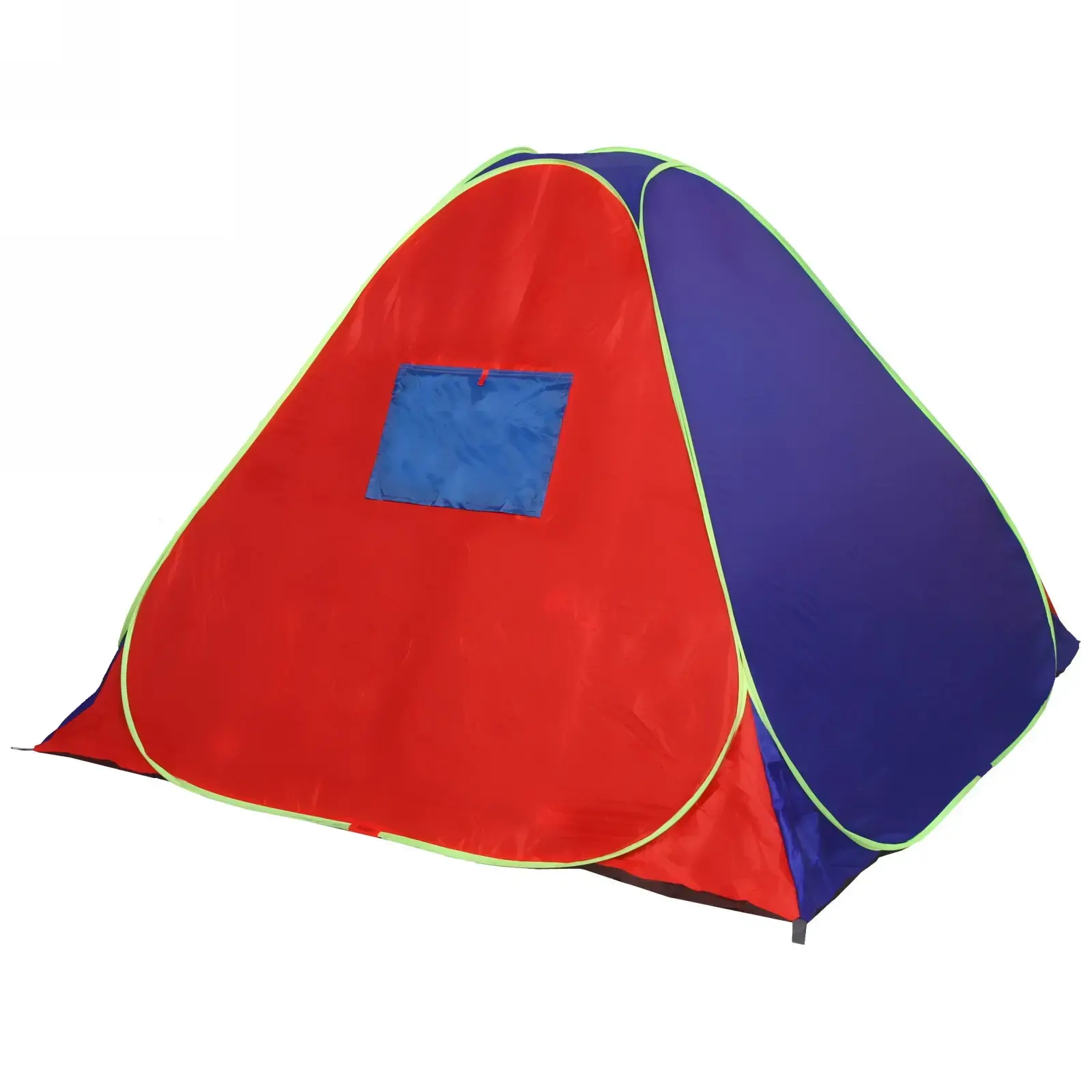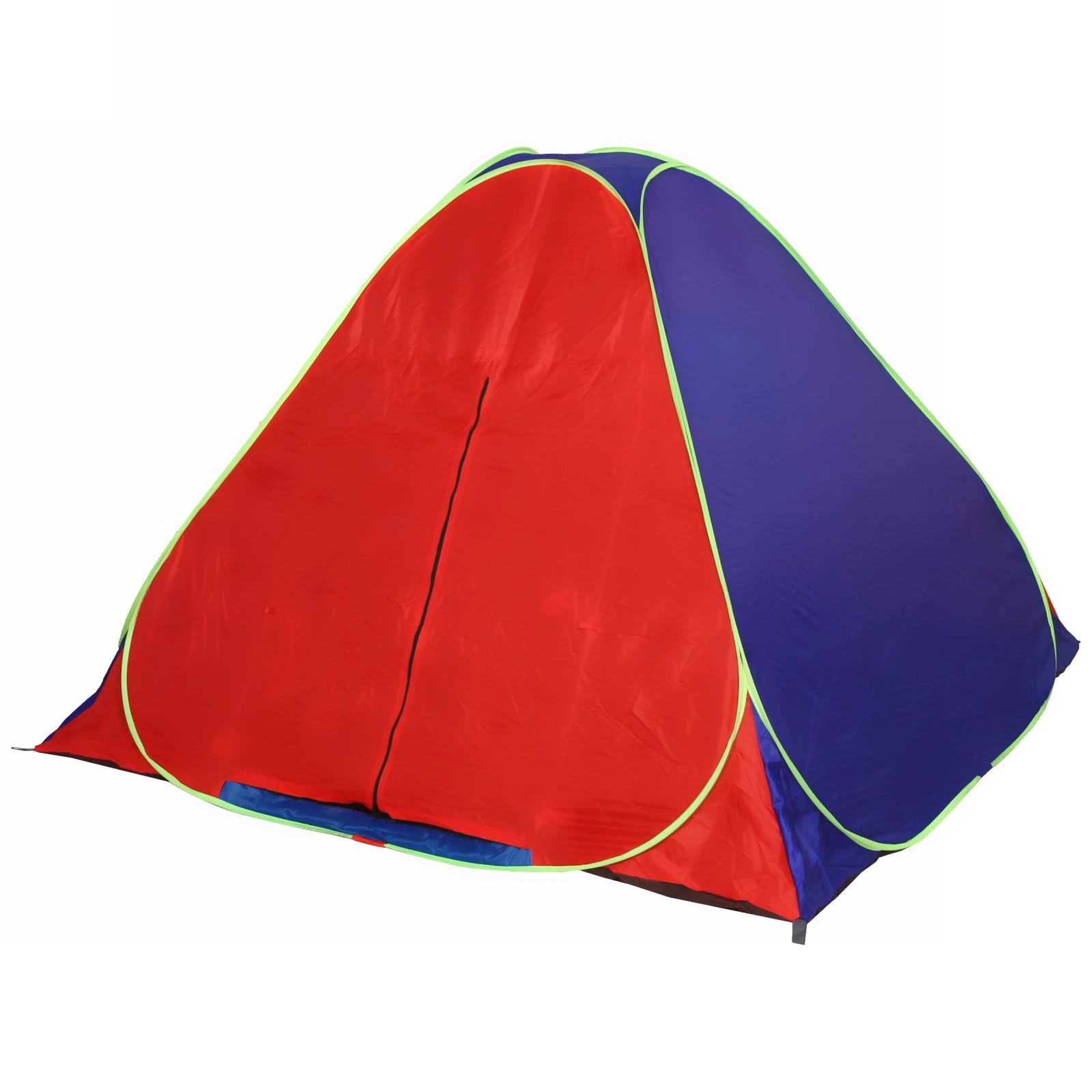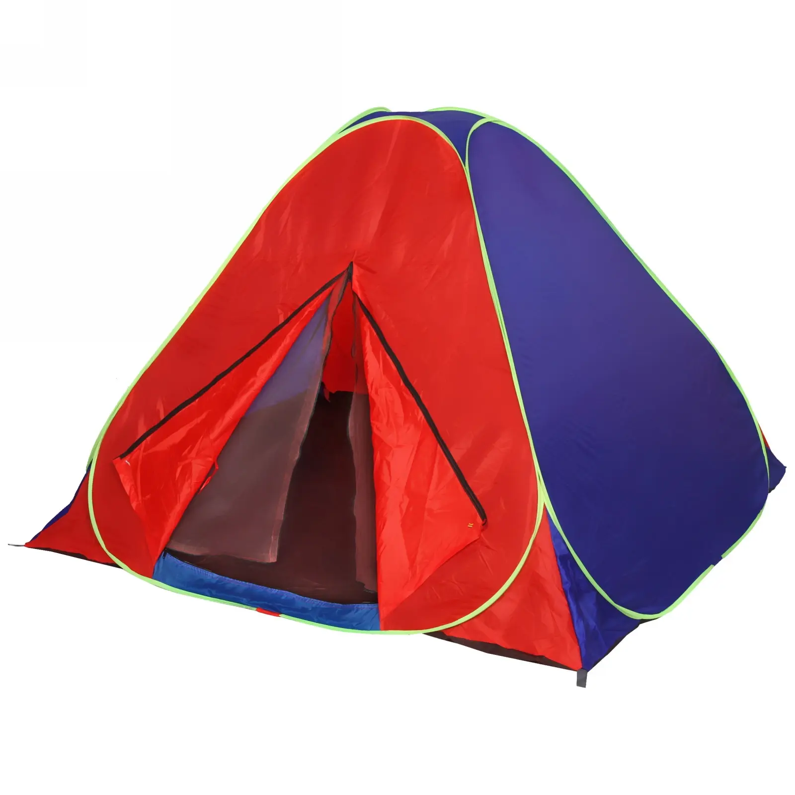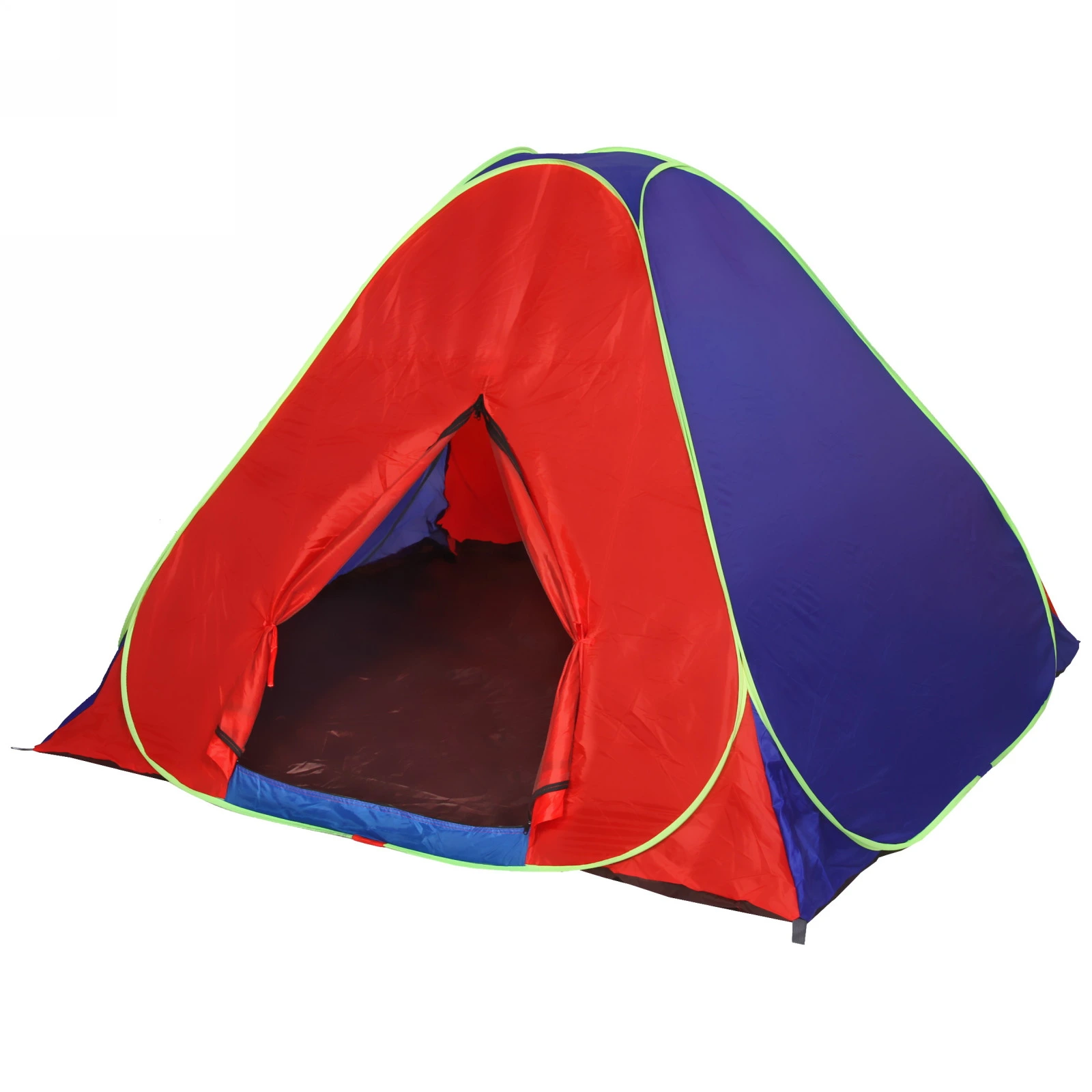 Палатка выполнена из прочных и легких материалов: металл, пластик и текстиль, что обеспечивает долговечность и надежность. Красно-синий цвет с зелеными окантовками не только привлекает внимание, но и делает палатку заметной на фоне природы. Внутреннее пространство палатки темного цвета создает уютную атмосферу, а большие входные двери обеспечивают удобный доступ и хорошую вентиляцию.