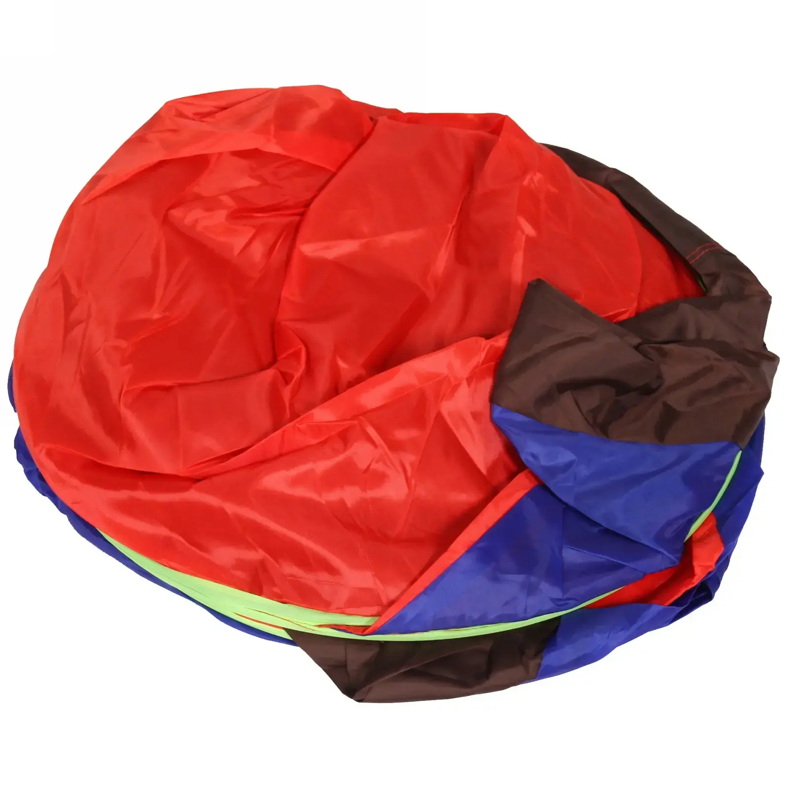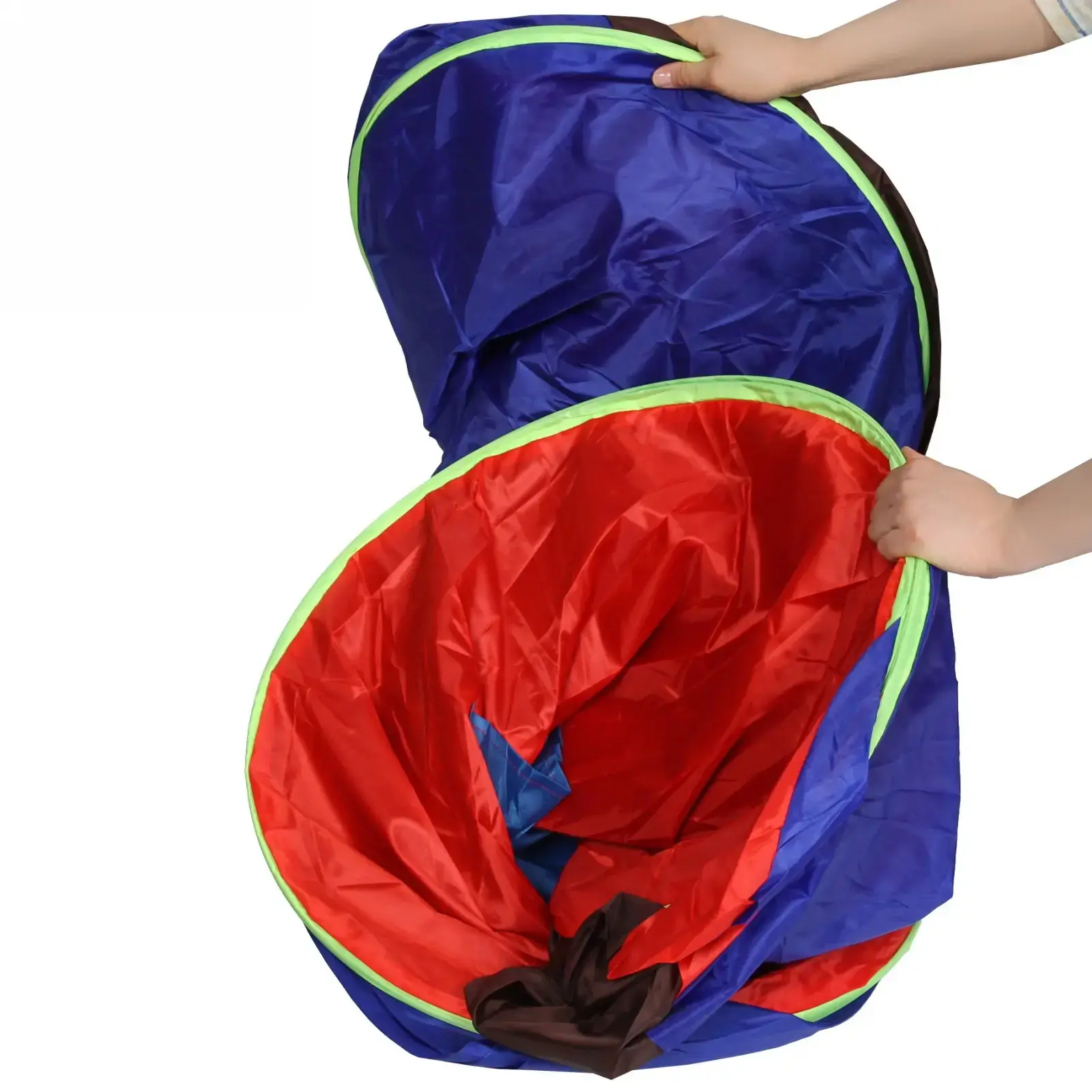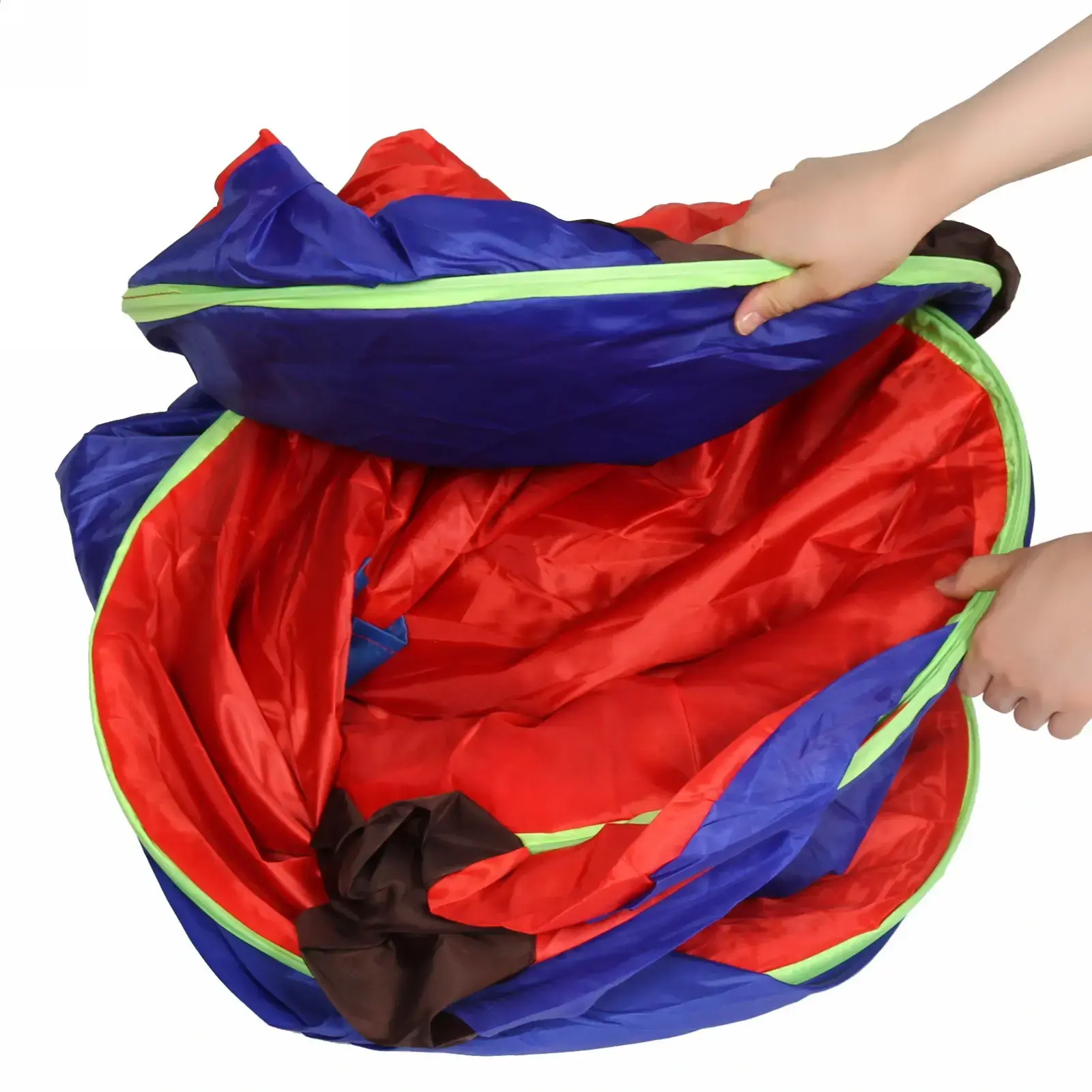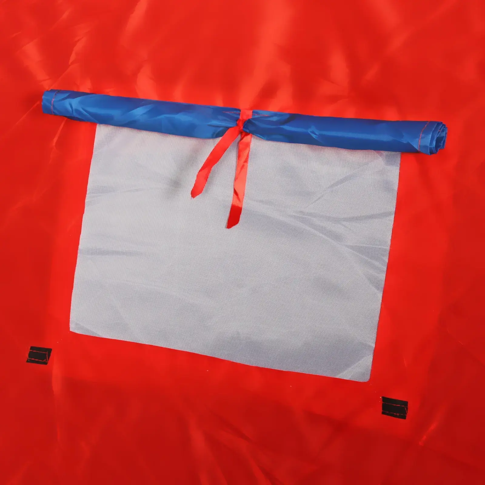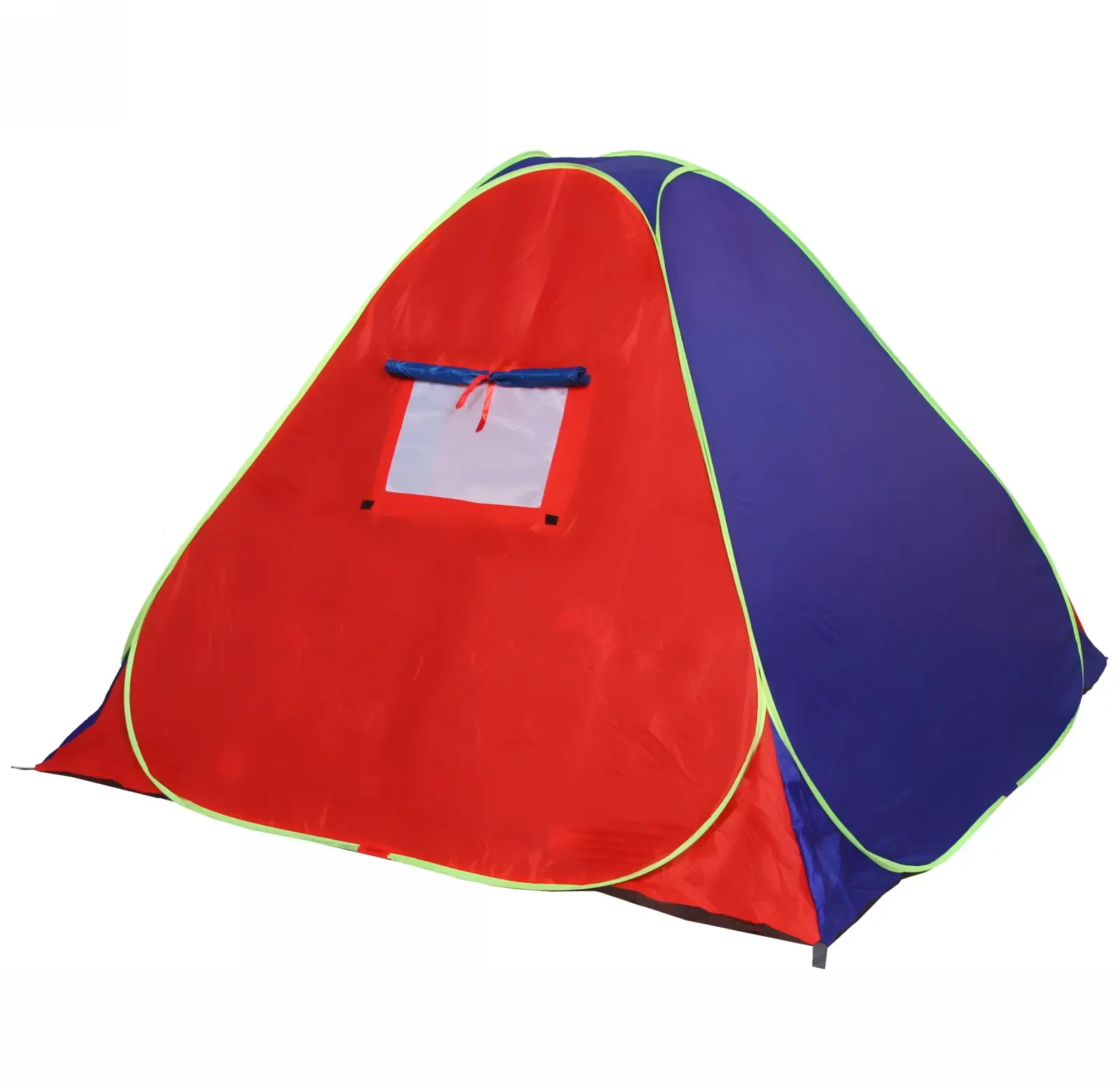 Палатка выполнена из прочных и легких материалов: металл, пластик и текстиль, что обеспечивает долговечность и надежность. Красно-синий цвет с зелеными окантовками не только привлекает внимание, но и делает палатку заметной на фоне природы. Внутреннее пространство палатки темного цвета создает уютную атмосферу, а большие входные двери обеспечивают удобный доступ и хорошую вентиляцию.