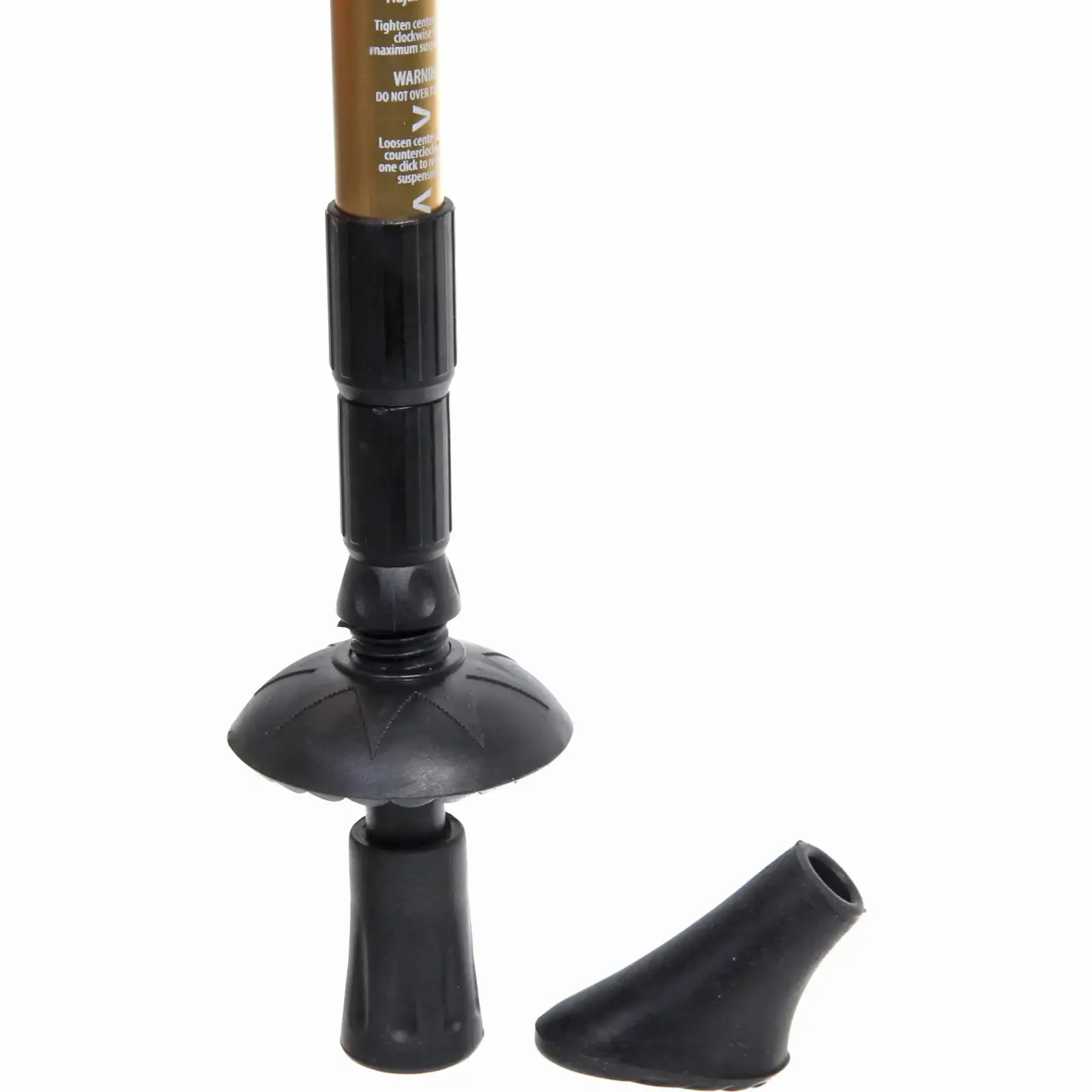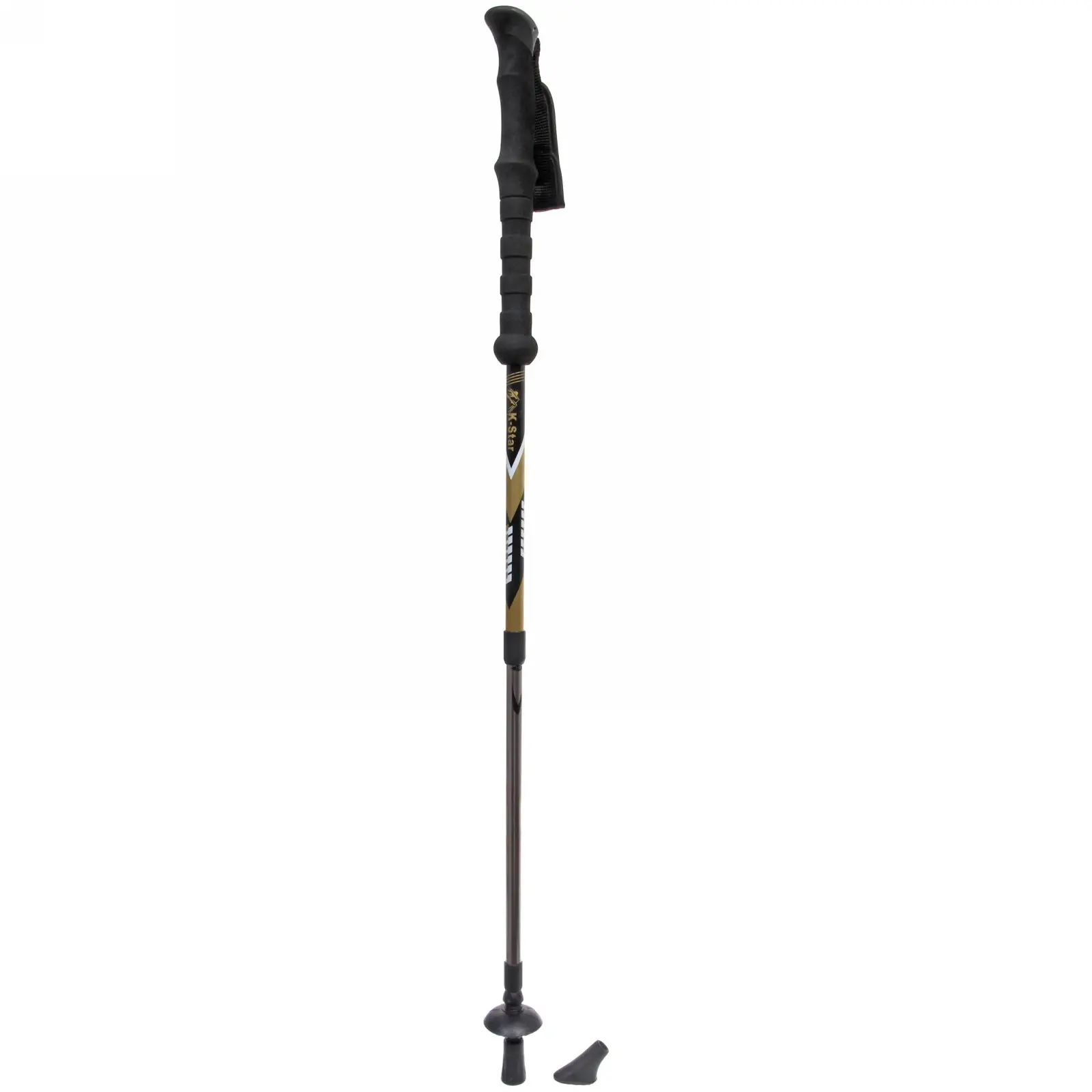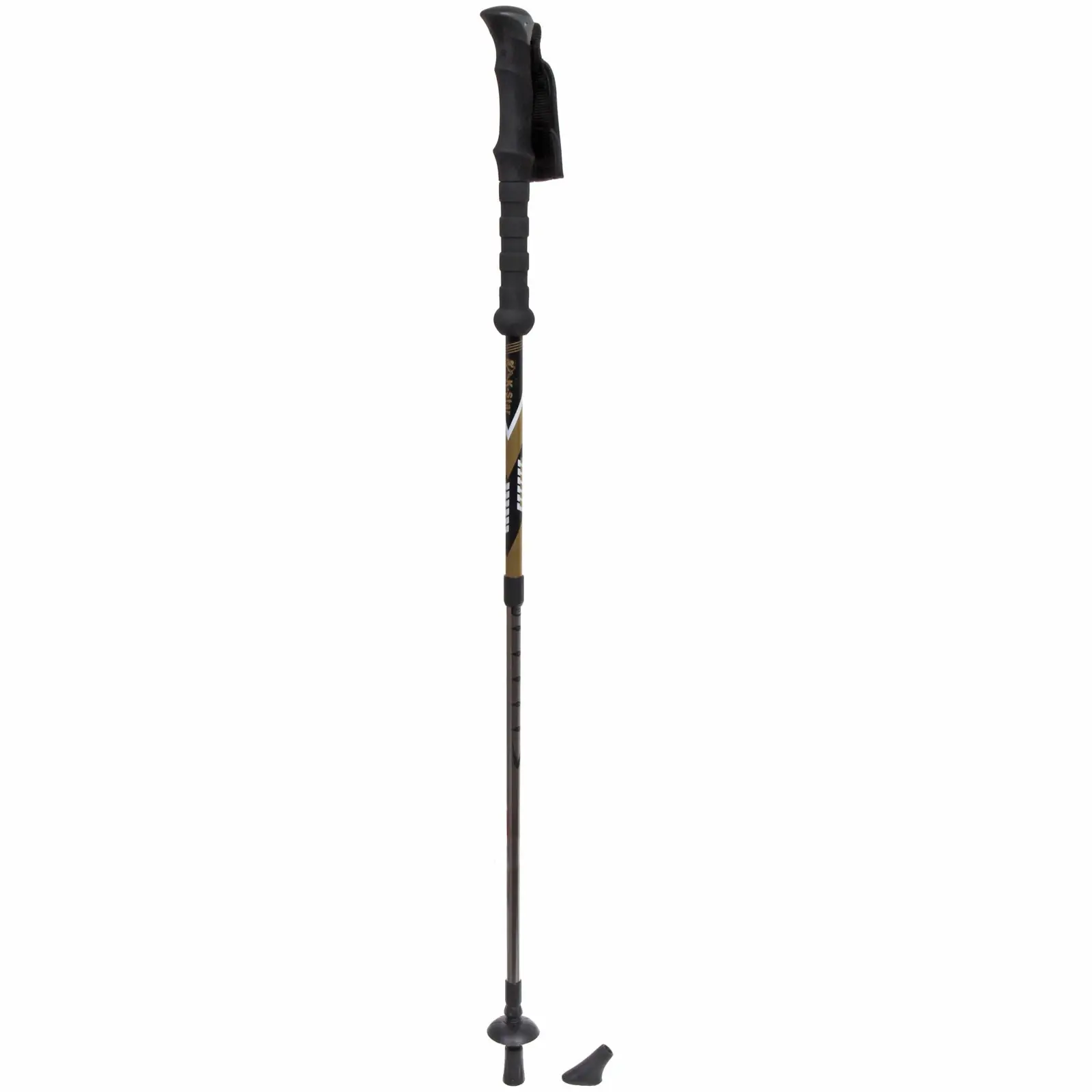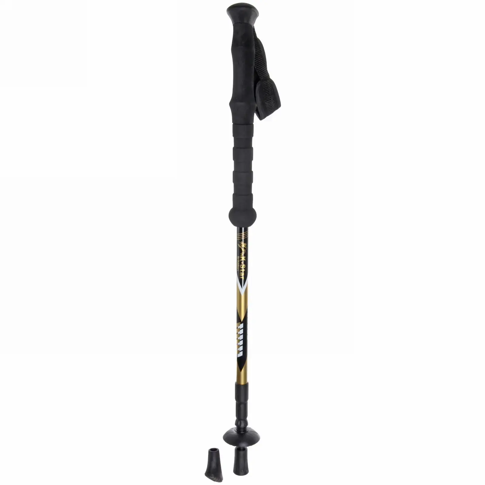 Чёрно-золотой дизайн сочетает функциональность с эстетикой. Резиновая насадка основания поглощает ударные нагрузки, а дополнительный «коготь» обеспечивает сцепление на рыхлом грунте. Вес 450 г оптимален для длительной эксплуатации без усталости рук.