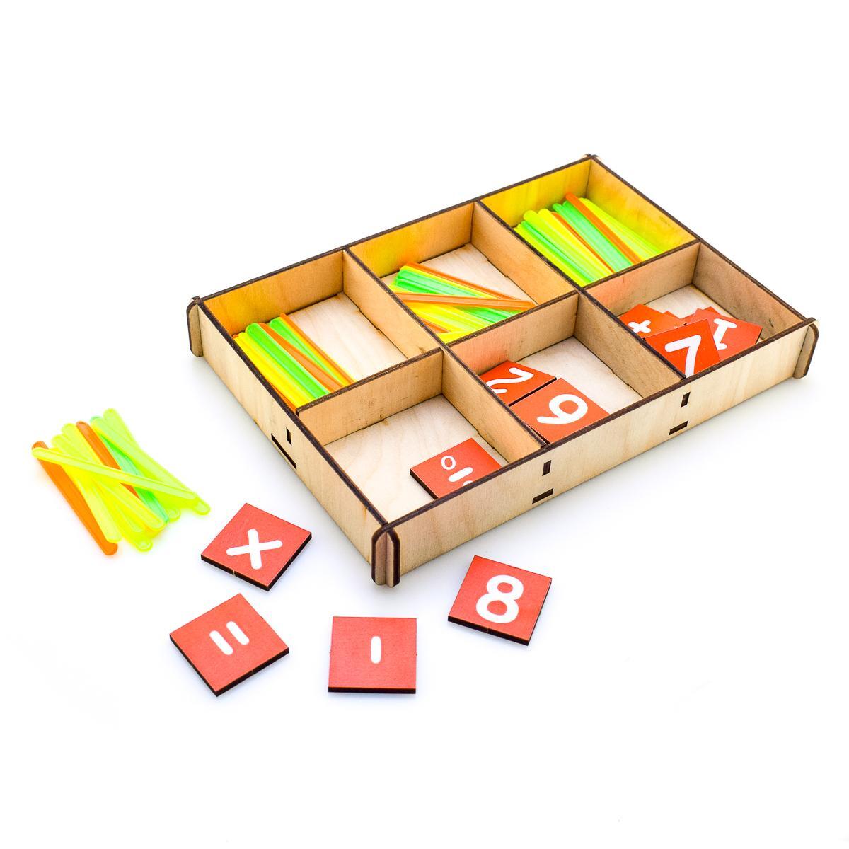 В набор входит деревянная коробка с четырьмя секциями, пластиковые палочки трёх цветов и карточки с математическими символами и цифрами. Всё продумано для комфорта детей и спокойствия взрослых — элементарная организация, привлекательные цвета, надёжные материалы.