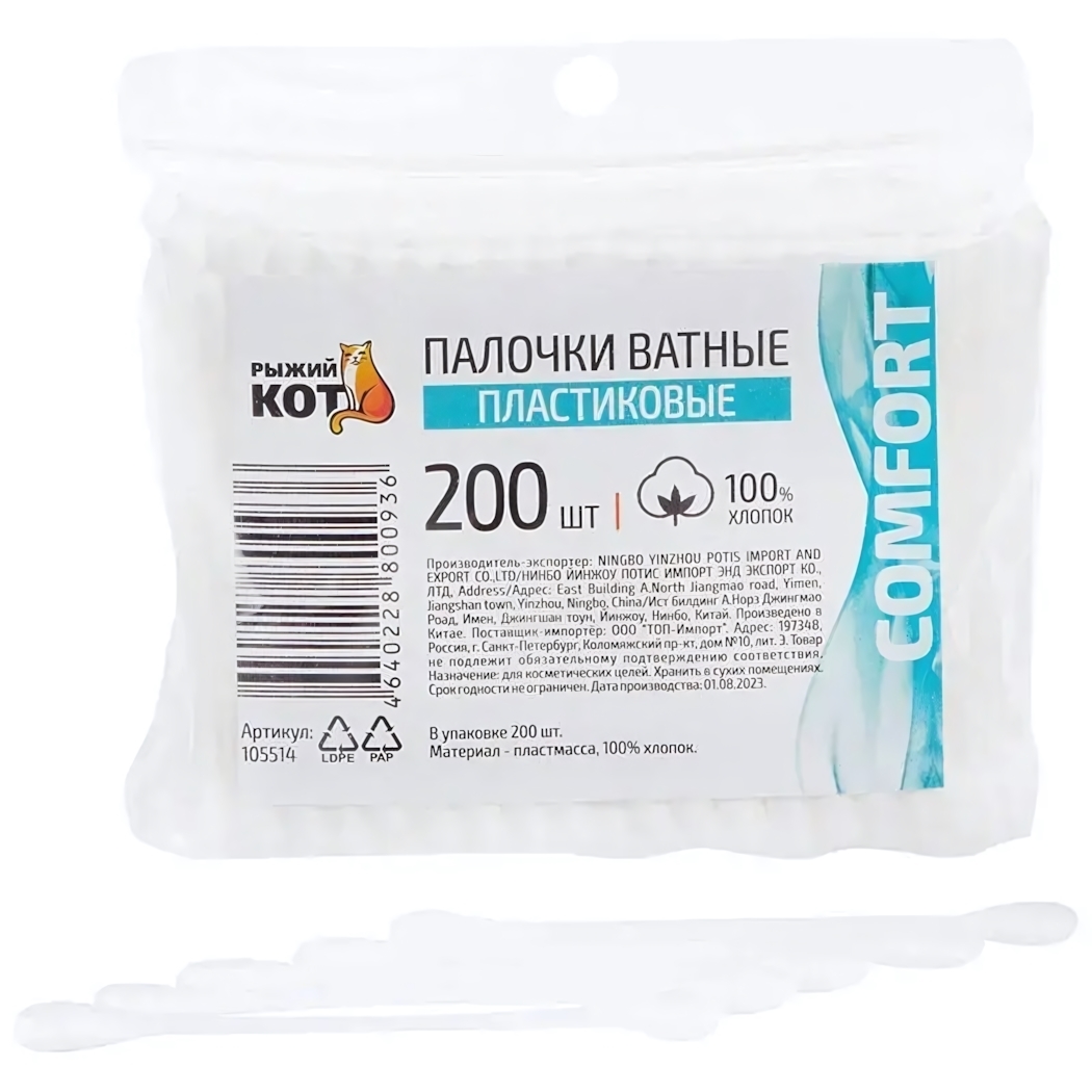 Палочки ватные пластиковые, 200 шт, 100% хлопок, удобные для ухода