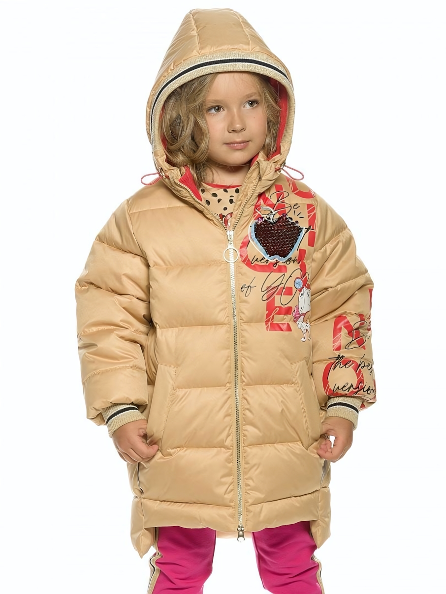 Пальто подходит для девочек размером 98 и станет отличным выбором для детских зимних выходов. Без сомнений, оно станет ярким акцентом в гардеробе вашей дочки благодаря золотистому цвету и оригинальным элементам дизайна, таким как пришитые сердечки и красивые фразы. Уютные резинки на рукавах защищают от ветра и морозов, а приятная на ощупь ткань снаружи обеспечивает дополнительный комфорт.