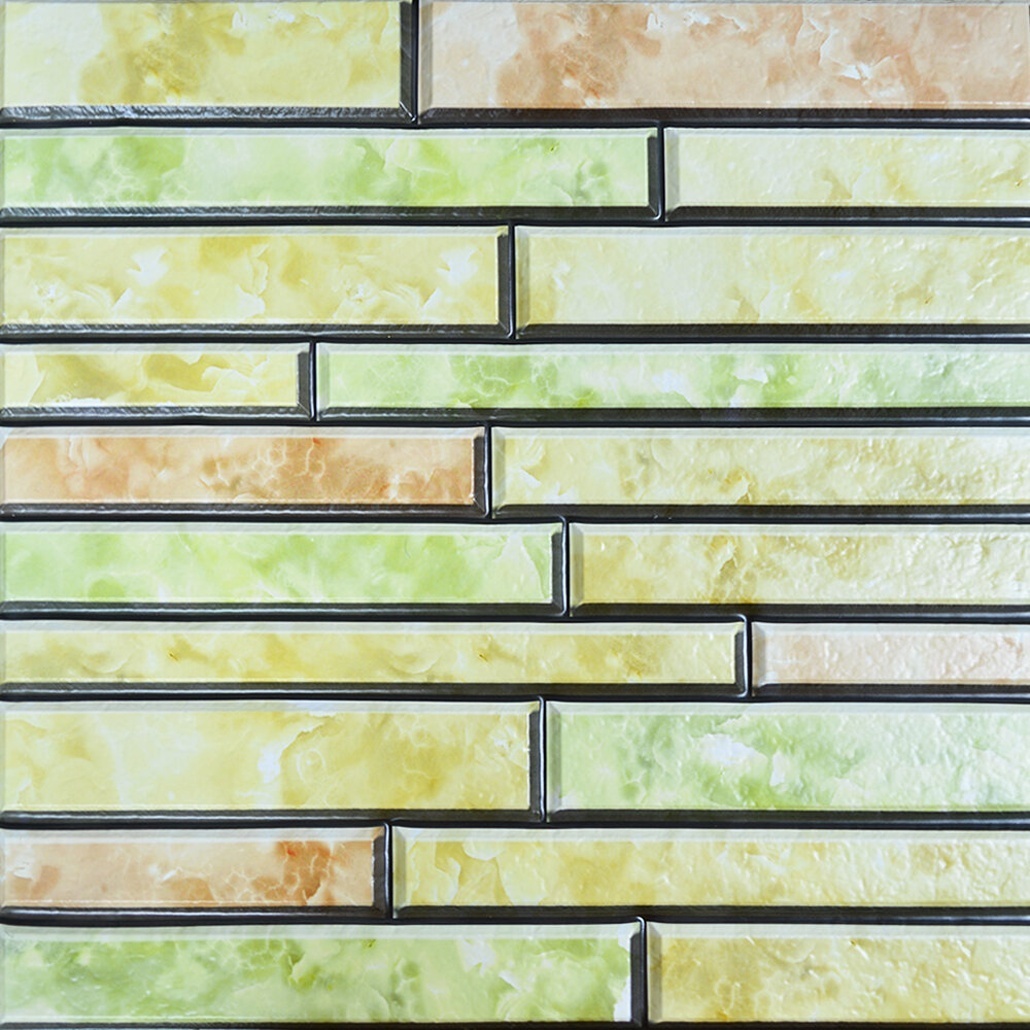Преимущества этой панели включают устойчивость к износу, водостойкость и привлекательный дизайн с имитацией брусчатого узора в желто-зеленых оттенках. Поверхность гладкая и блестящая, что визуально расширяет пространство и создает яркое настроение в комнате.