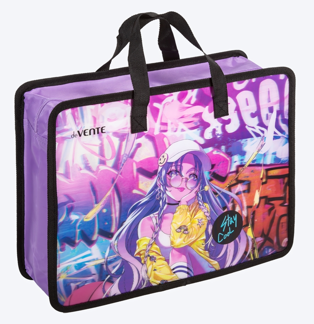 Папка изготовлена из качественного пластика с водоотталкивающими свойствами. Светло-фиолетовый цвет с черной окантовкой и яркий принт создают современный стильный образ. Текстильные элементы добавляют комфорта при использовании.