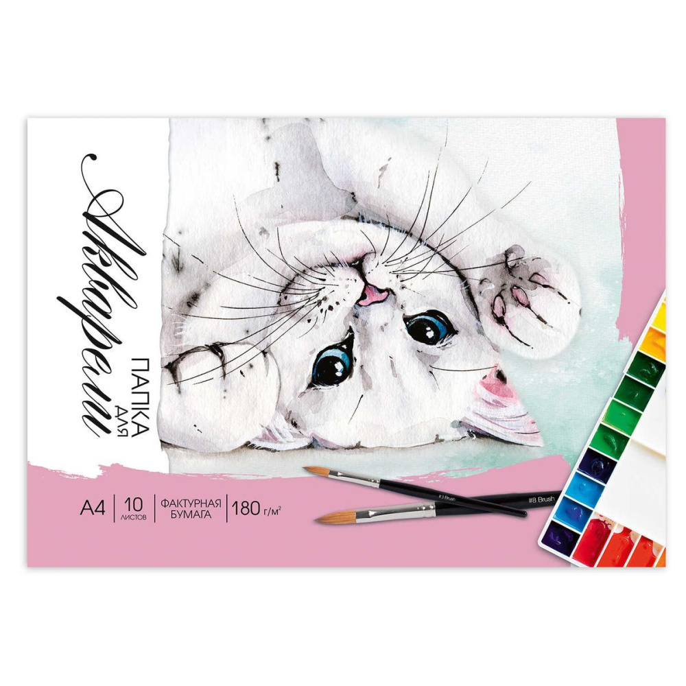 Папка для акварели А4, 10 листов, 'Котик', мелованный картон 240 г/м², бумага 180 г/м²