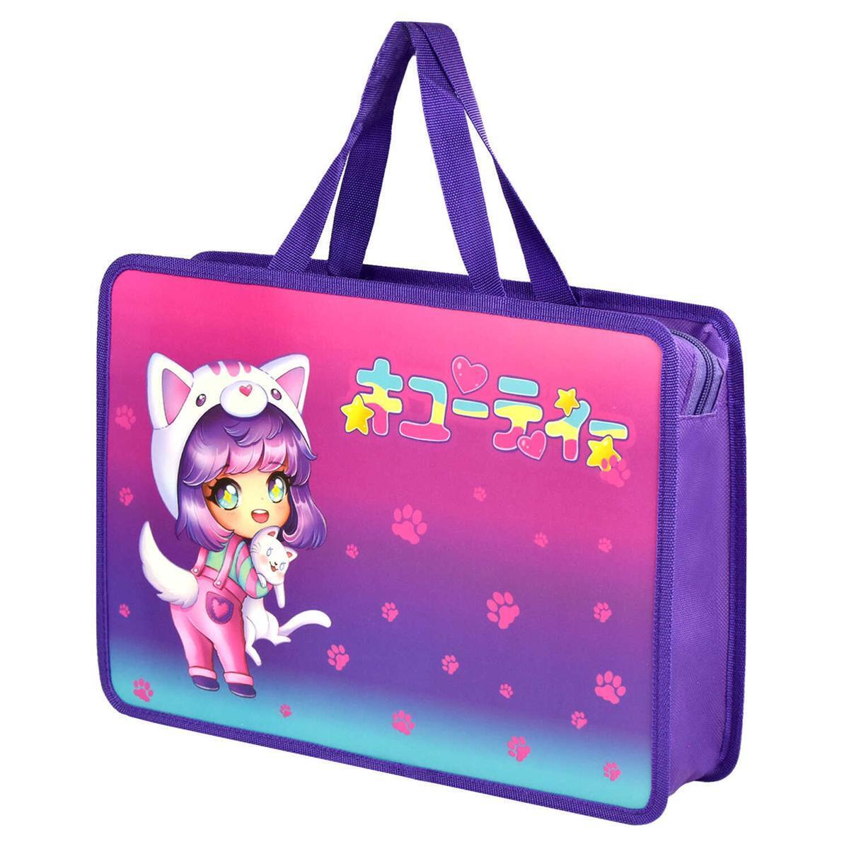 Папка-сумка для тетрадей A4 "Чиби", 34х25х9.5см, фиолетовая с ручками, на молнии