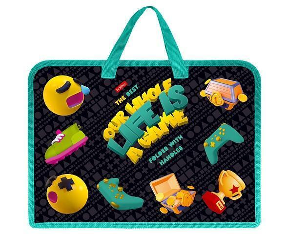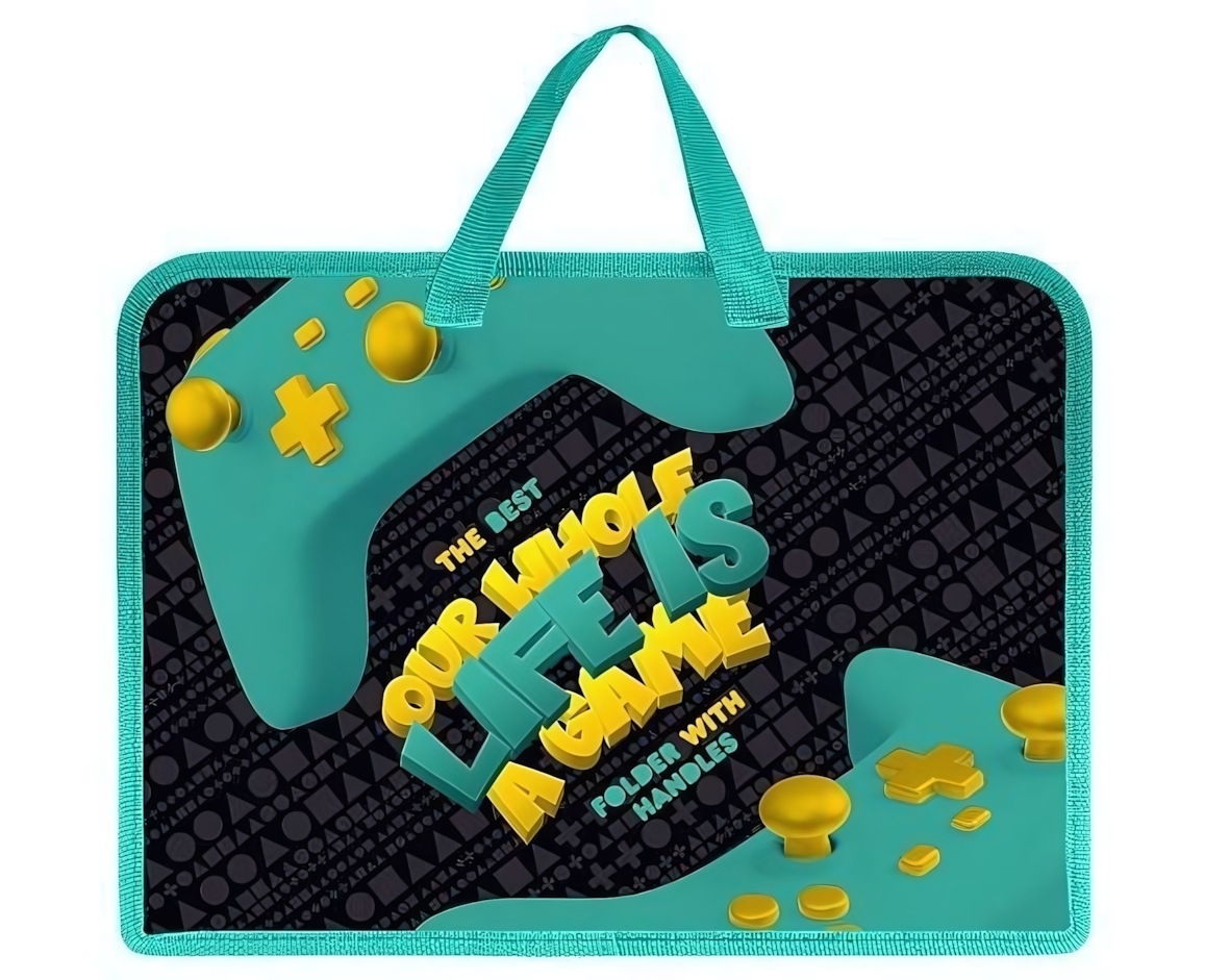Папка формата А4 (245х340х70 мм) вмещает до 50 листов. Легко очищается влажной салфеткой благодаря гладкой поверхности. Желтые акценты на бирюзовом фоне создают позитивное настроение, а стилизованные элементы геймпадов делают аксессуар узнаваемым.