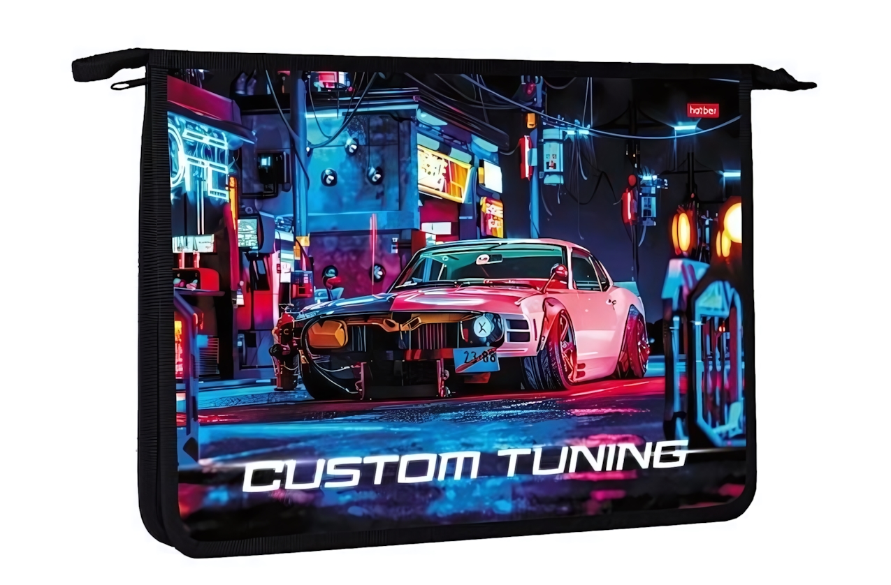 Дизайн с надписью «CUSTOM TUNING» и изображением спортивного автомобиля превращает обычную папку в модный аксессуар. Чёрная окантовка подчёркивает графичность рисунка, делая её заметной в любом рюкзаке.