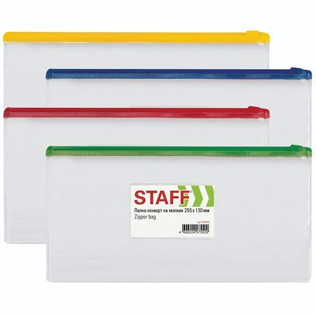 Папка-конверт на молнии "STAFF", 255х130мм, прозрачный пластик 0,12мм, карман для визиток, цветные молнии