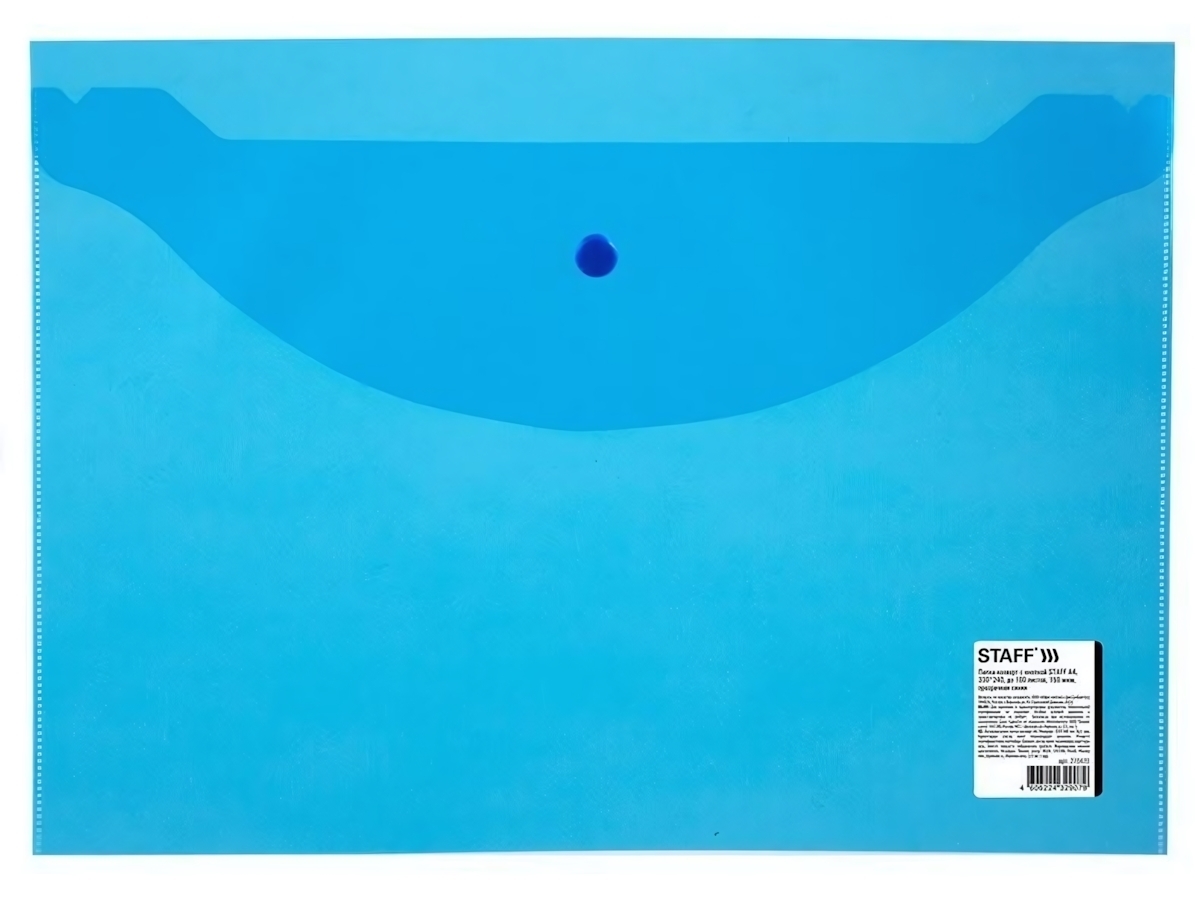 Папка-конверт с кнопкой STAFF — это идеальное решение для хранения и транспортировки документов. Она обеспечивает надежную защиту от повреждений и загрязнений, что делает ее незаменимым аксессуаром для школьников, студентов и офисных работников. Благодаря своему прозрачному дизайну, вы всегда сможете быстро найти нужные бумаги, не открывая папку.