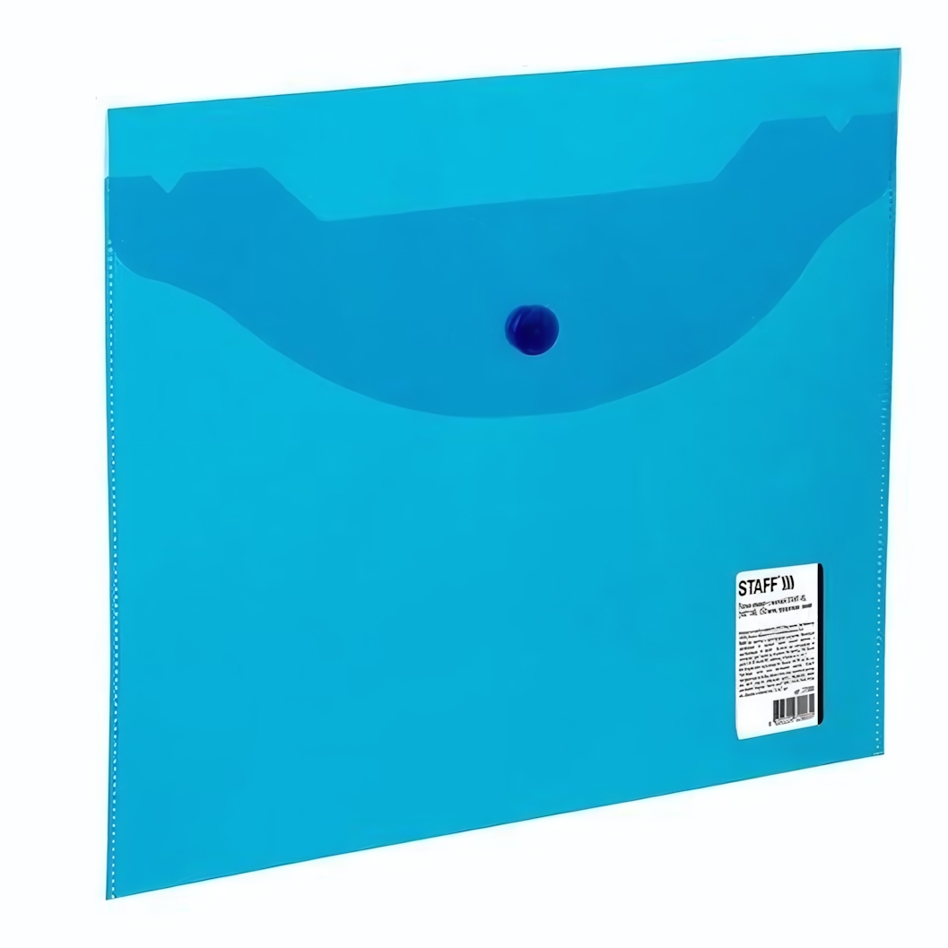 Папка-конверт А5 с кнопкой, 240х190 мм, прозрачная синяя, до 100 листов, STAFF