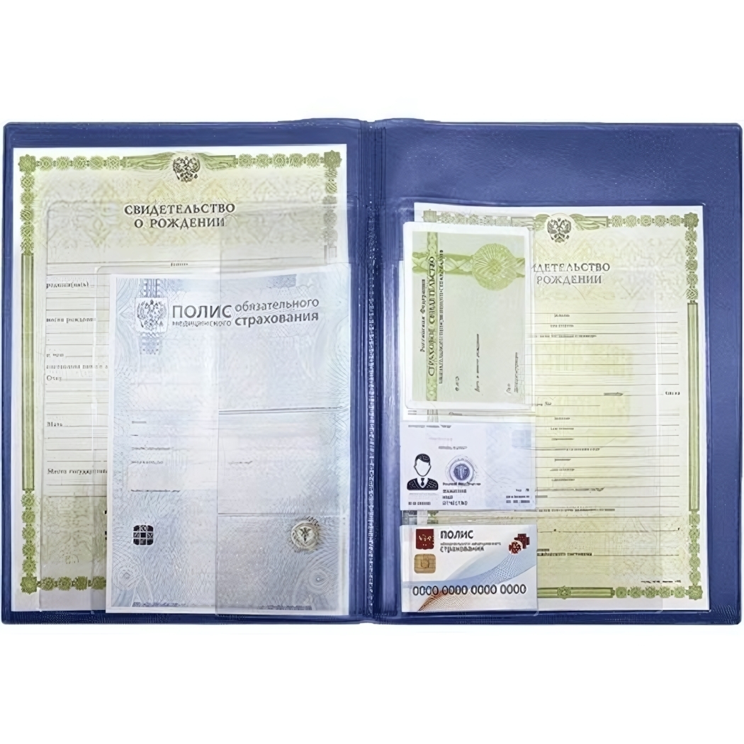 Распределите документы по категориям: первый файл — полис ОМС, следующие — свидетельство о рождении, СНИЛС, медицинские карты. Глубокий синий цвет обложки создаёт деловое впечатление при визитах в госучреждения. Удобные боковые вырезы позволяют извлекать листы без повреждения уголков.