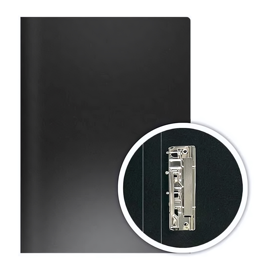 Классический черный цвет и лаконичный дизайн подходят для деловой среды. Усиленный корешок 15 мм сохраняет форму даже при полной загрузке. Гладкая поверхность устойчива к царапинам и легко очищается от пыли.